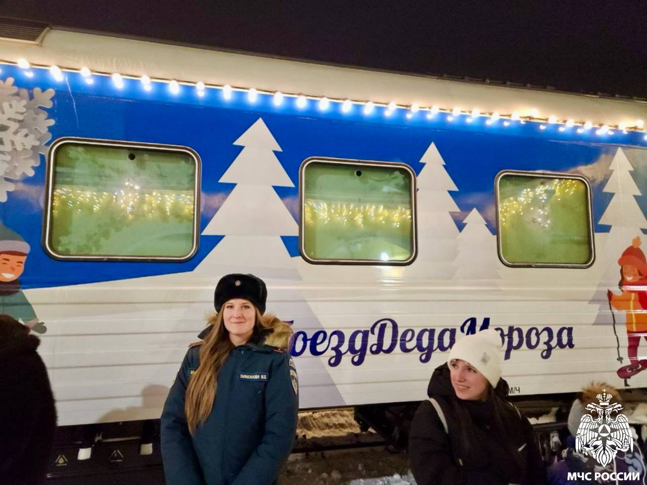 Одновременно с этим сотрудники МЧС осуществляли комплекс мер по обеспечению пожарной безопасности на передвижной новогодней резиденции Поезд Деда Мороза в Великих Луках и Дно.