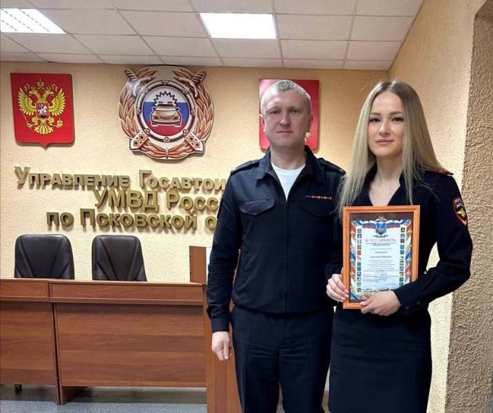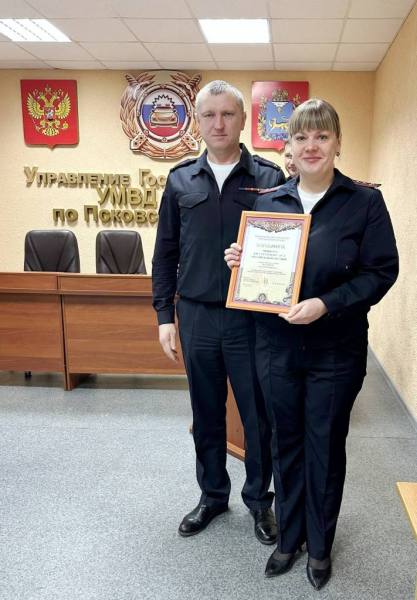 Благодарностью УМВД России по Псковской области поощрена старший лейтенант полиции Ангелина Шевцова, госинспектор МРЭО.