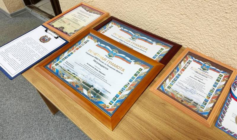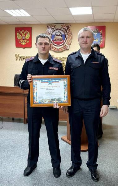 Почетная грамота УМВД России по Псковской области вручена майору полиции Денису Бучинскому, старшему госинспектору МРЭО, капитану полиции Алексею Петрову, старшему госинспектору МРЭО, старшему лейтенанту полиции Юлии Даниловой, госинспектору МРЭО.