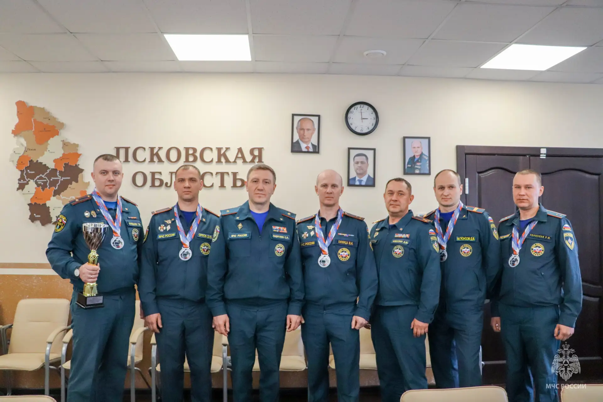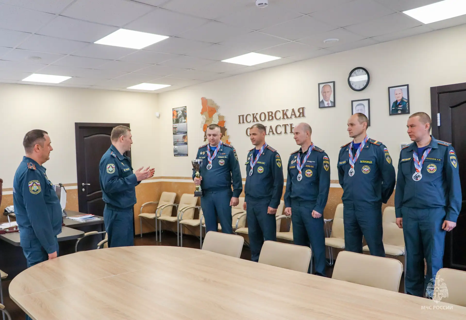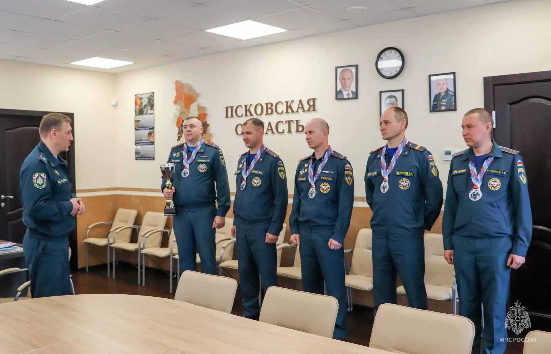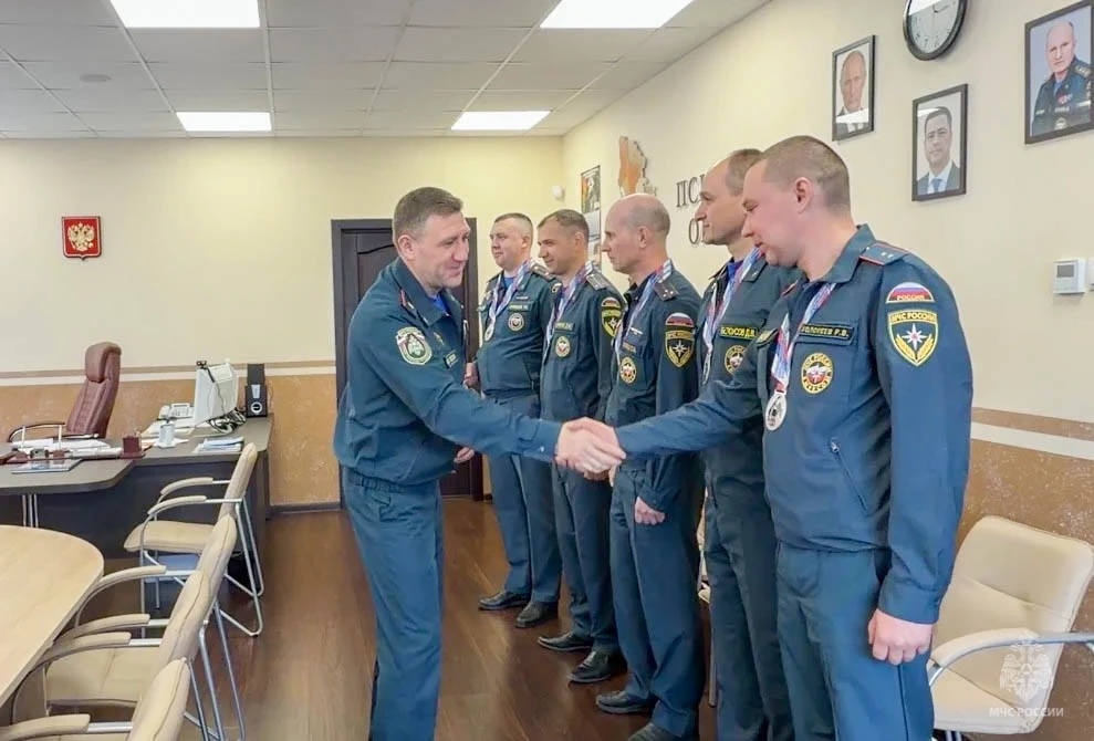 Начальник Главного управления МЧС России по Псковской области Сергей Лаврухин и заместитель руководителя псковского чрезвычайного ведомства по государственной противопожарной службе Андрей Никулин поздравили наших ребят с прекрасным результатом и пожелали им дальнейших успехов и новых достижений.