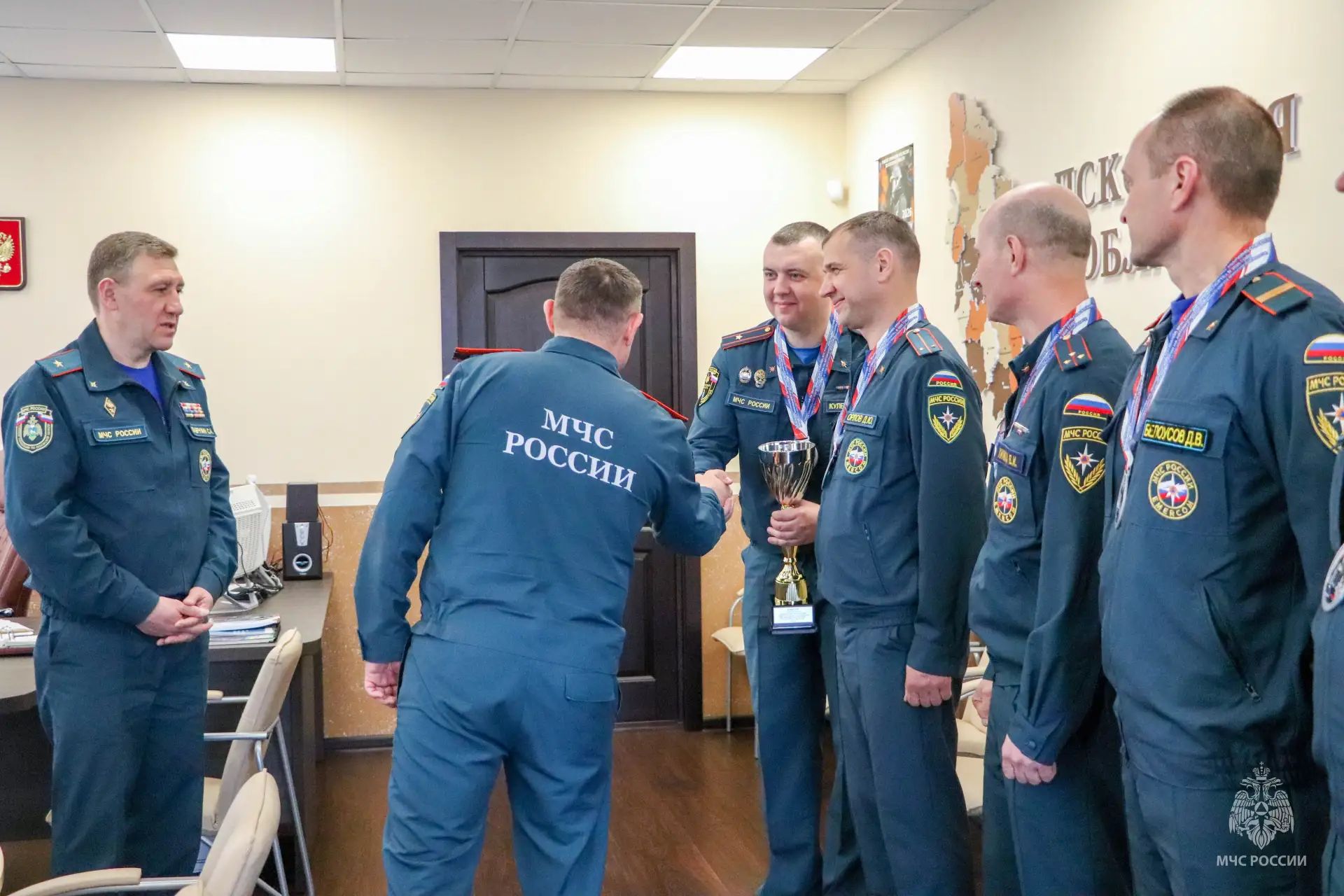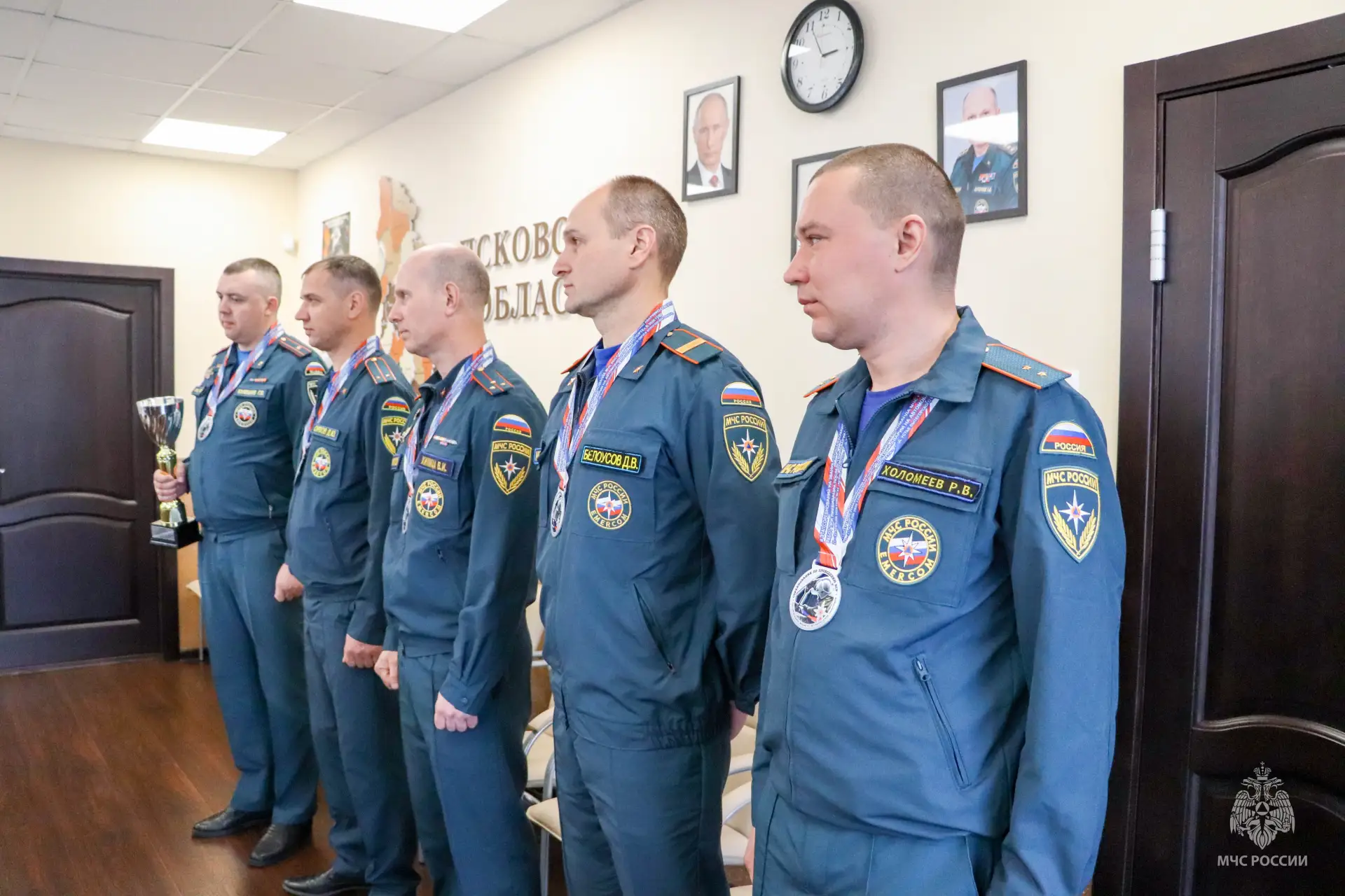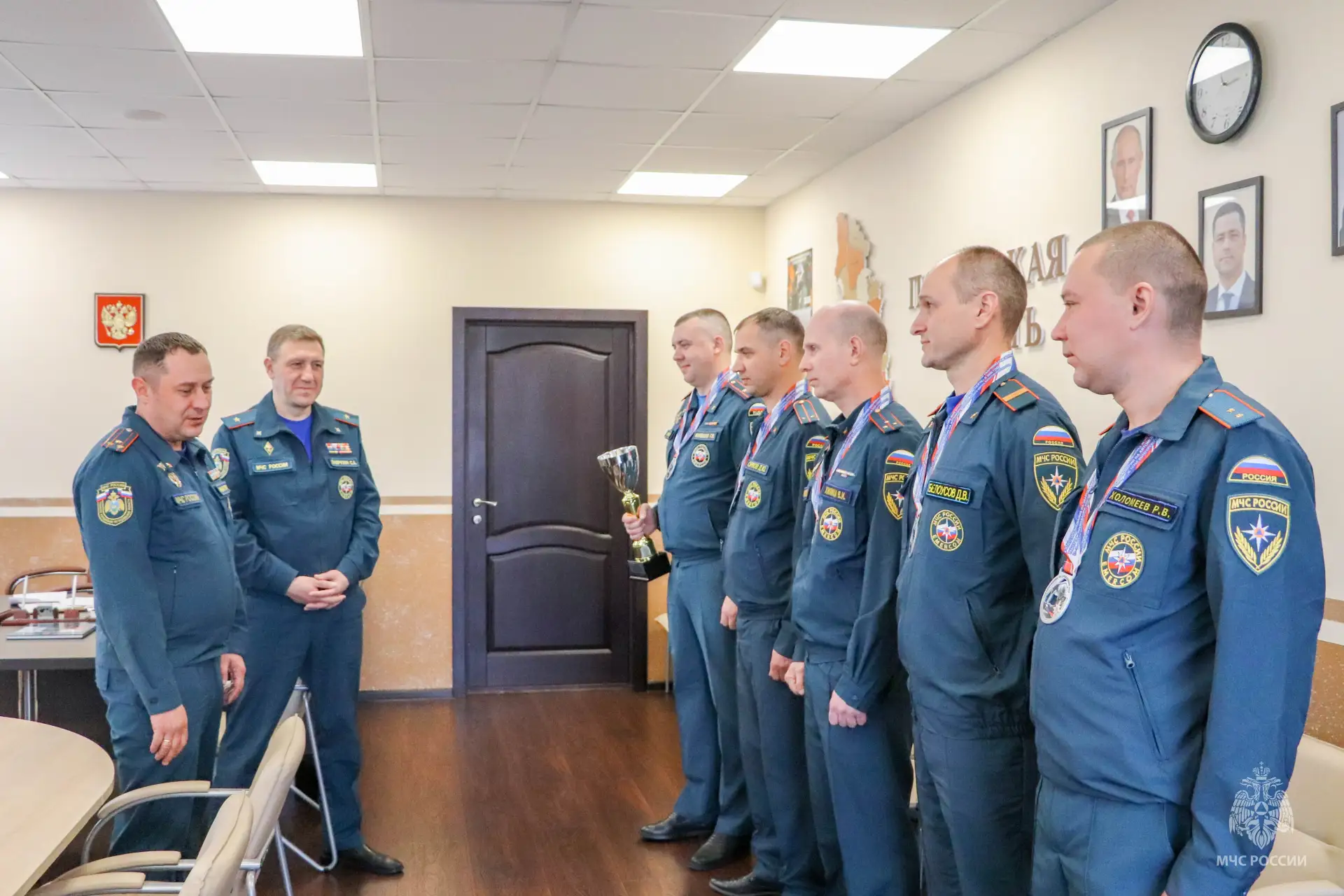 Начальник Главного управления МЧС России по Псковской области Сергей Лаврухин и заместитель руководителя псковского чрезвычайного ведомства по государственной противопожарной службе Андрей Никулин поздравили наших ребят с прекрасным результатом и пожелали им дальнейших успехов и новых достижений.