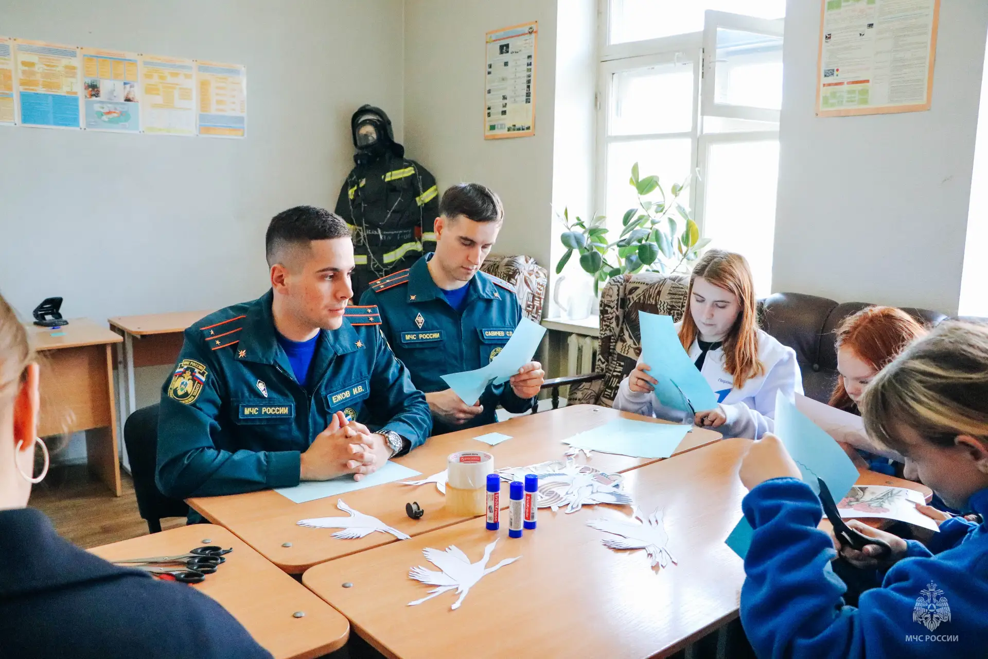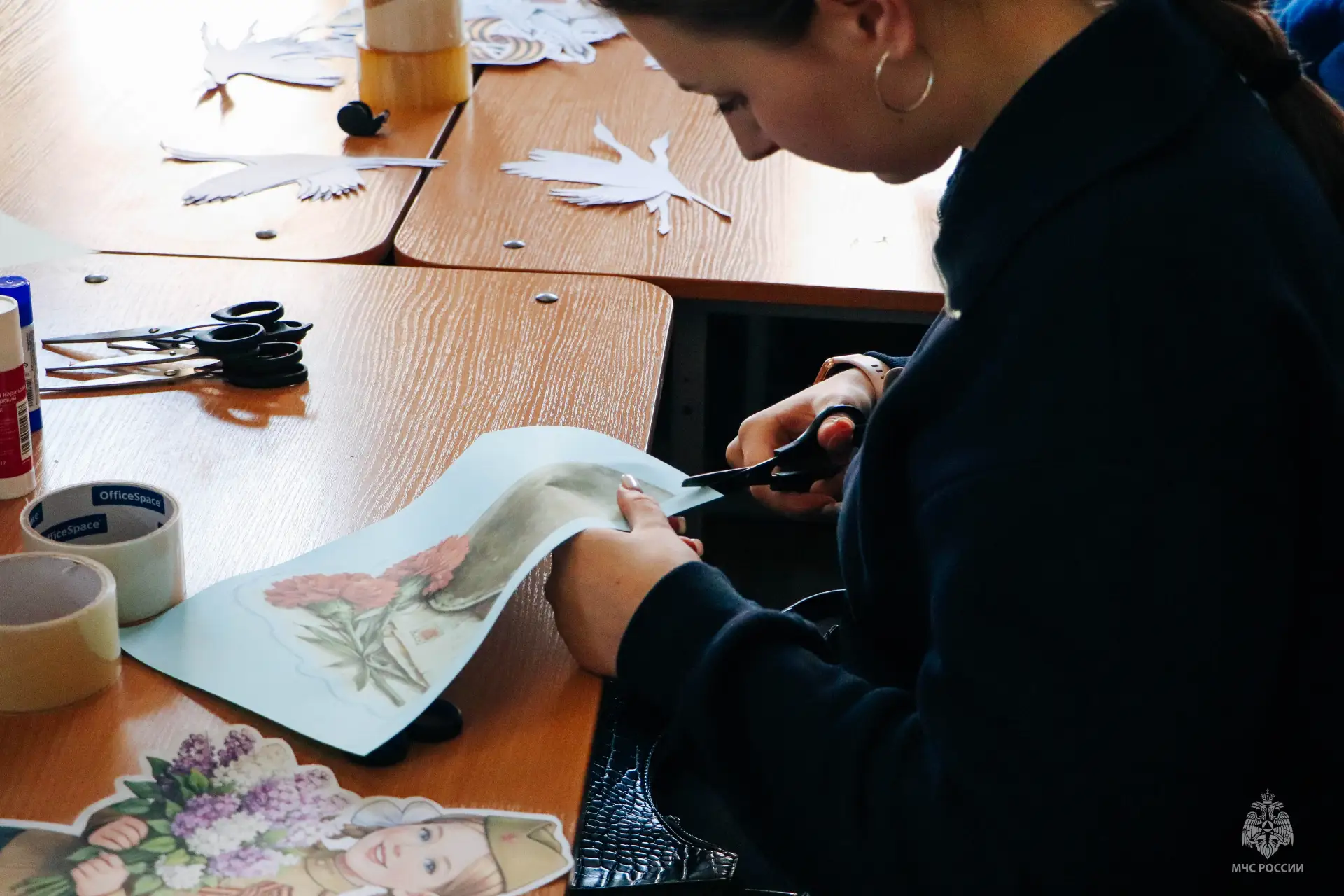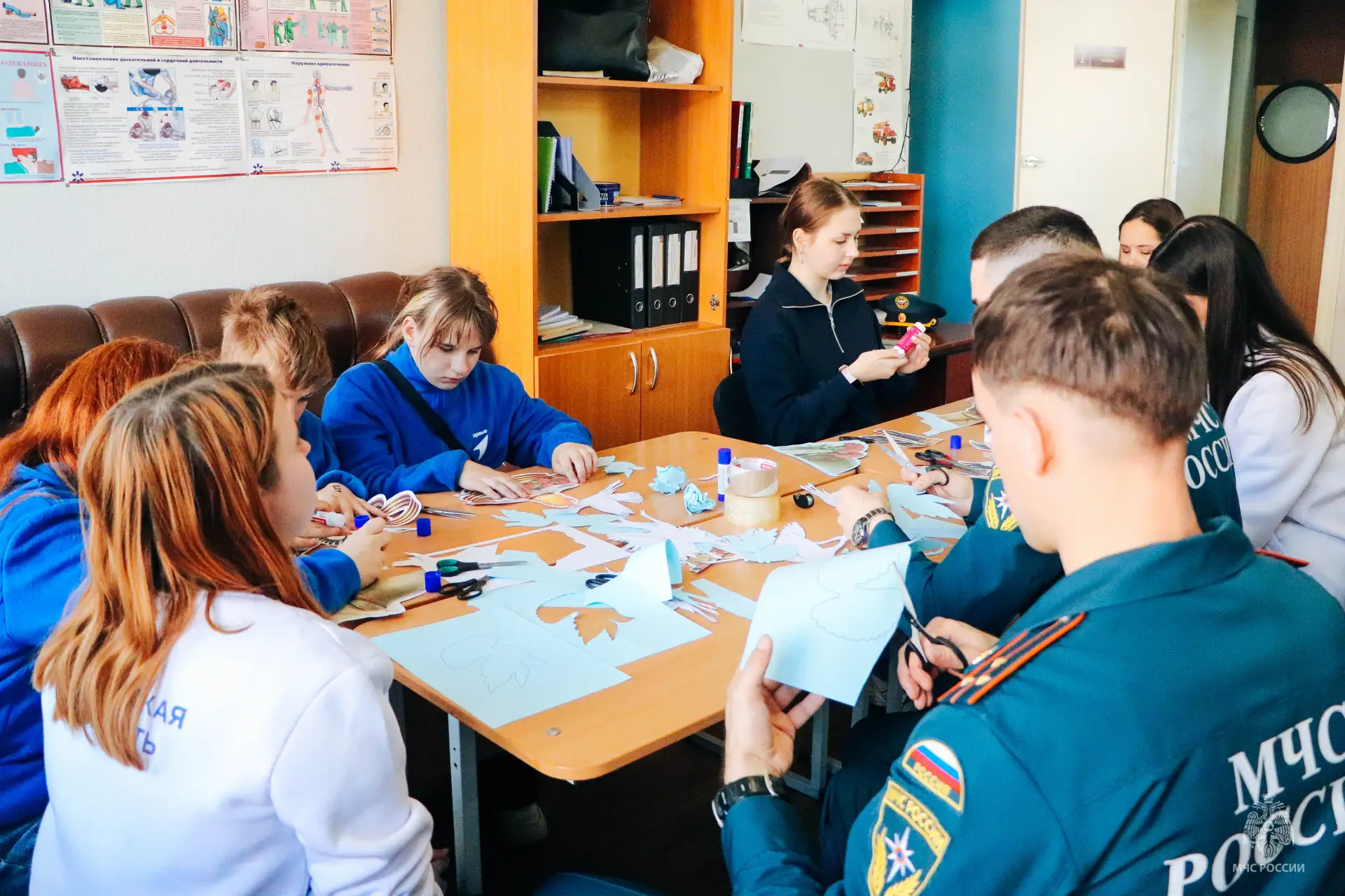 Члены Молодежного совета ведомства провели встречу с ребятами, где поделились интересными фактами о своей непростой, но важной работе, а также напомнили о правилах безопасного поведения. Кроме того, ребята вместе с сотрудниками МЧС России вырезали и украсили героической символикой окна отдельного поста пожарно-спасательной части № 1.