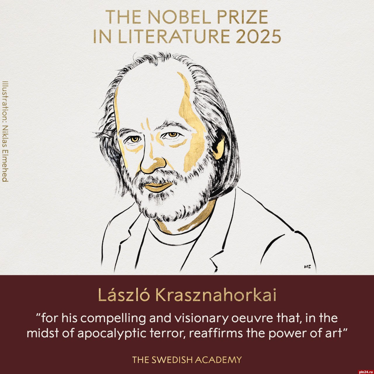 «Нобелевская премия по литературе за 2025 год присуждена венгерскому писателю Ласло Краснахоркаи "за его убедительное и дальновидное творчество, которое в разгар апокалиптического ужаса вновь подтверждает силу искусства". Ласло Краснахоркаи — великий писатель-эпик, представитель центральноевропейской традиции, которая простирается от Кафки до Томаса Бернхарда и характеризуется абсурдизмом и гротескными преувеличениями. Но у него есть и другие струны, и он также обращается к Востоку, используя более созерцательный, тонко выверенный тон», - говорится на сайте.