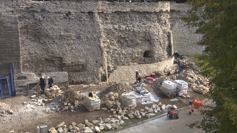 В Пскове идет ремонт стены Окольного города у Ольгинского моста. Ее состояние подрядчик оценивает как аварийное.