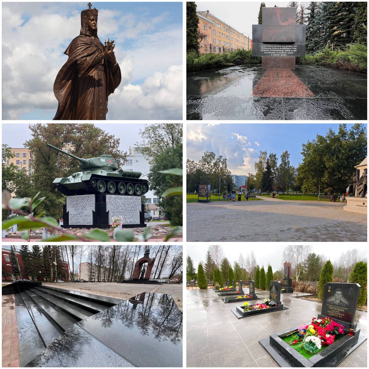 Отреставрировали Памятный знак сотрудникам ОВД, погибшим в годы Великой Отечественной войны и при исполнении служебного долга. Провели ремонт лестницы в сквере Дома Офицеров. На площади Героев-Десантников восстановили памятник освободителям Пскова «Танк Т-34». Благоустроили территорию мемориала 6-й роты, выполнив все необходимые работы. Привели в порядок сквер Пограничников, обновив покрытие у памятника. На площади аэропорта был установлен памятник Святой равноапостольной княгине Ольге, создав тем самым новый символ для гостей и жителей города.