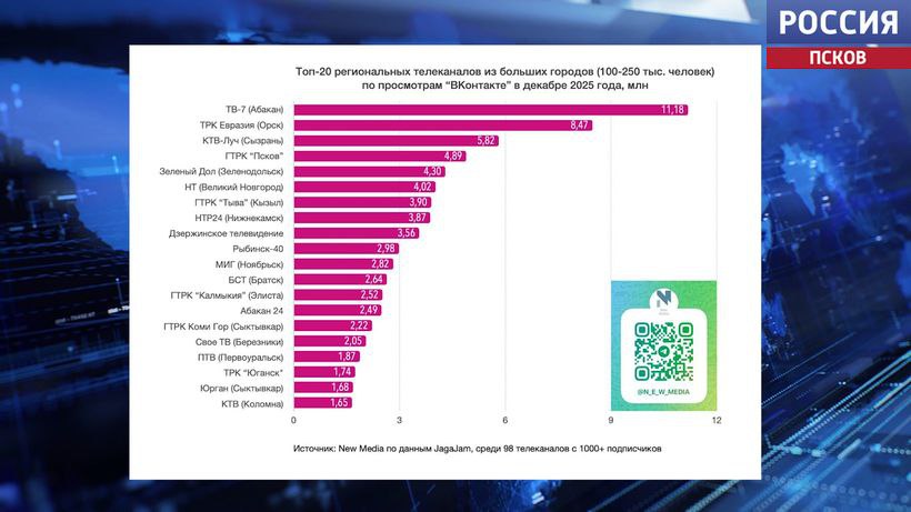 По количеству просмотров в декабре мы заняли четвертое место в России среди городов с населением до 250 тысяч человек. Как сообщили в Телеграм-канале New Media, по данным JagaJam, посты ГТРК "Псков" в социальной сети "ВКонтакте" посмотрели почти...