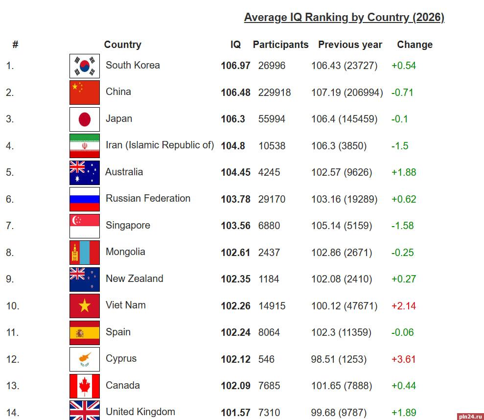 Россия заняла 6-е место в рейтинге стран по уровню среднего IQ