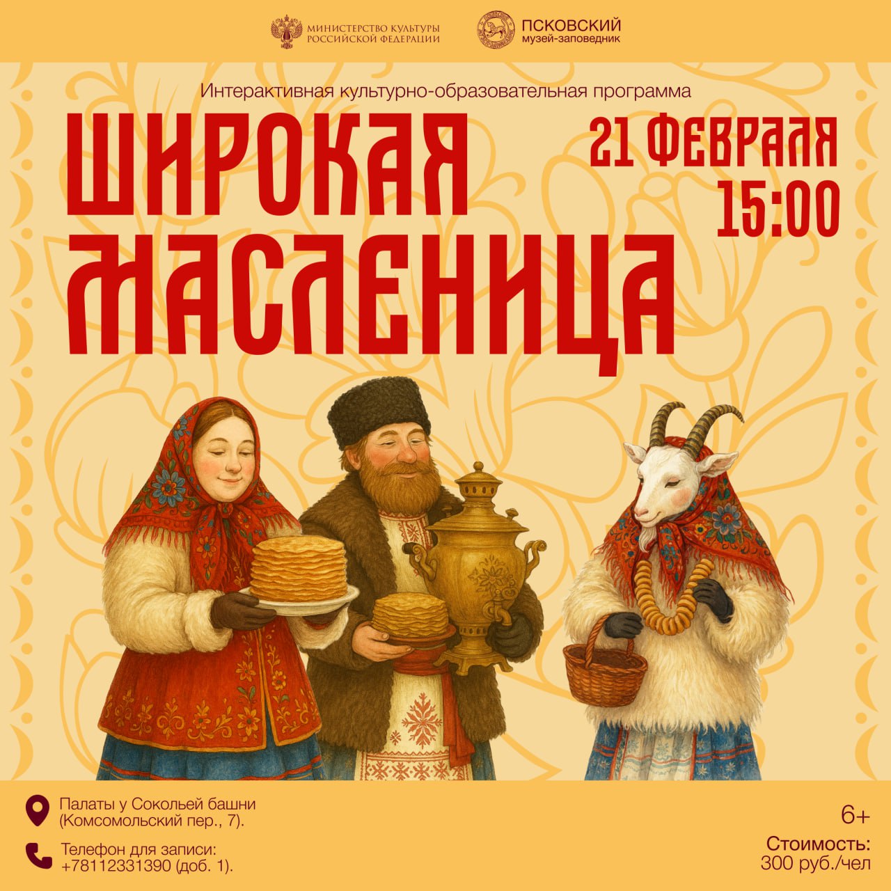 В Палатах у Сокольей башни в обстановке русской избы участники узнают о значении Масленицы для русского народа и обрядах каждого дня большой масленичной недели, смастерят масленичное чучело, познакомятся с рецептами традиционной псковской кухни, поучаствуют в традиционных русских играх и забавах.