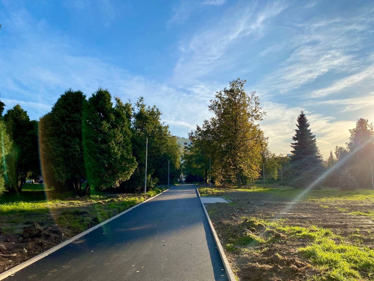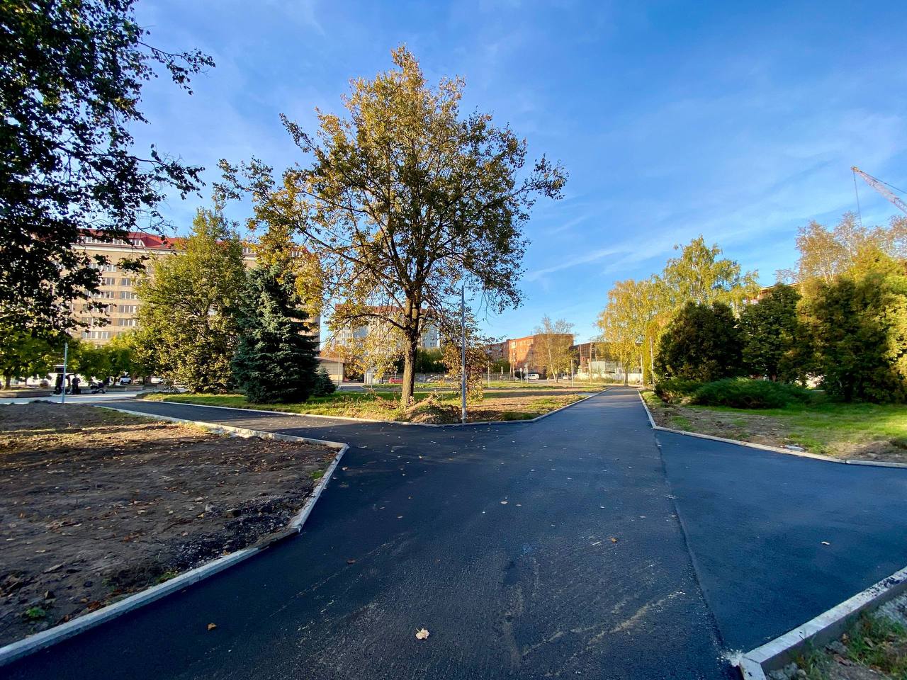 Появился асфальт на пешеходных дорожках, на некоторых участках плитка, установлены опоры освещения и детская площадка.