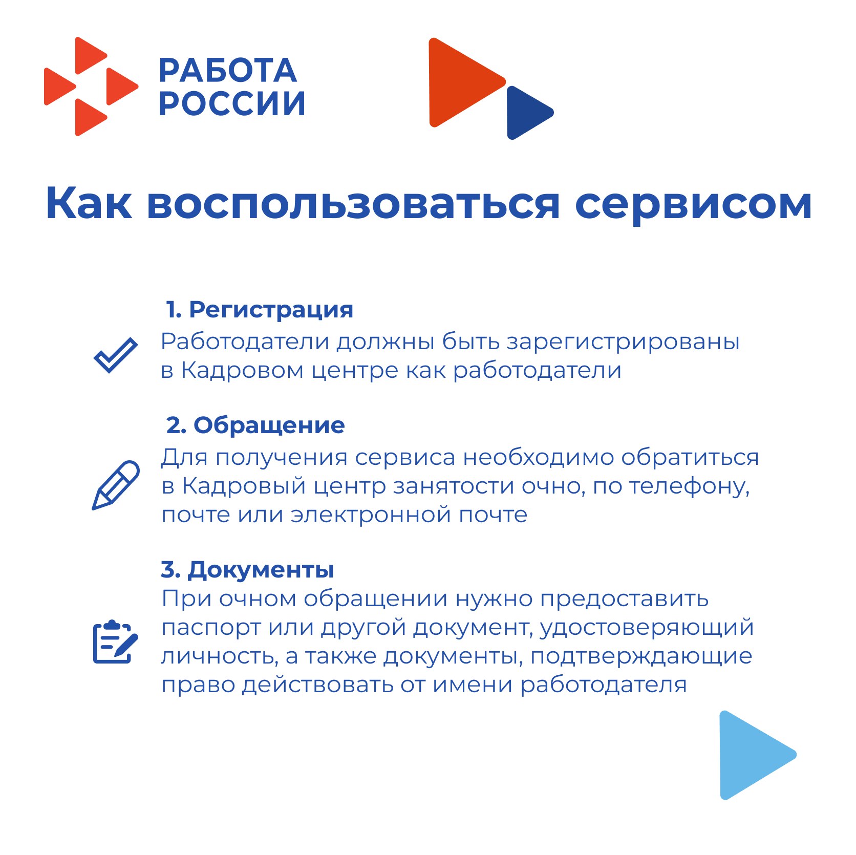 Для того, чтобы воспользоваться сервисом, необходимо обратиться в Кадровые центры «Работа России» https://clck.ru/3FkVdk