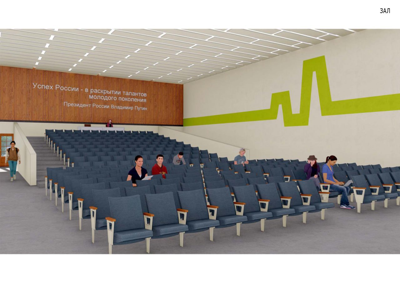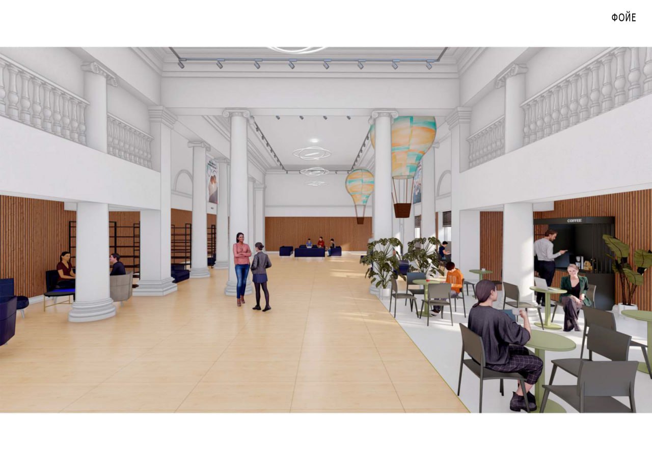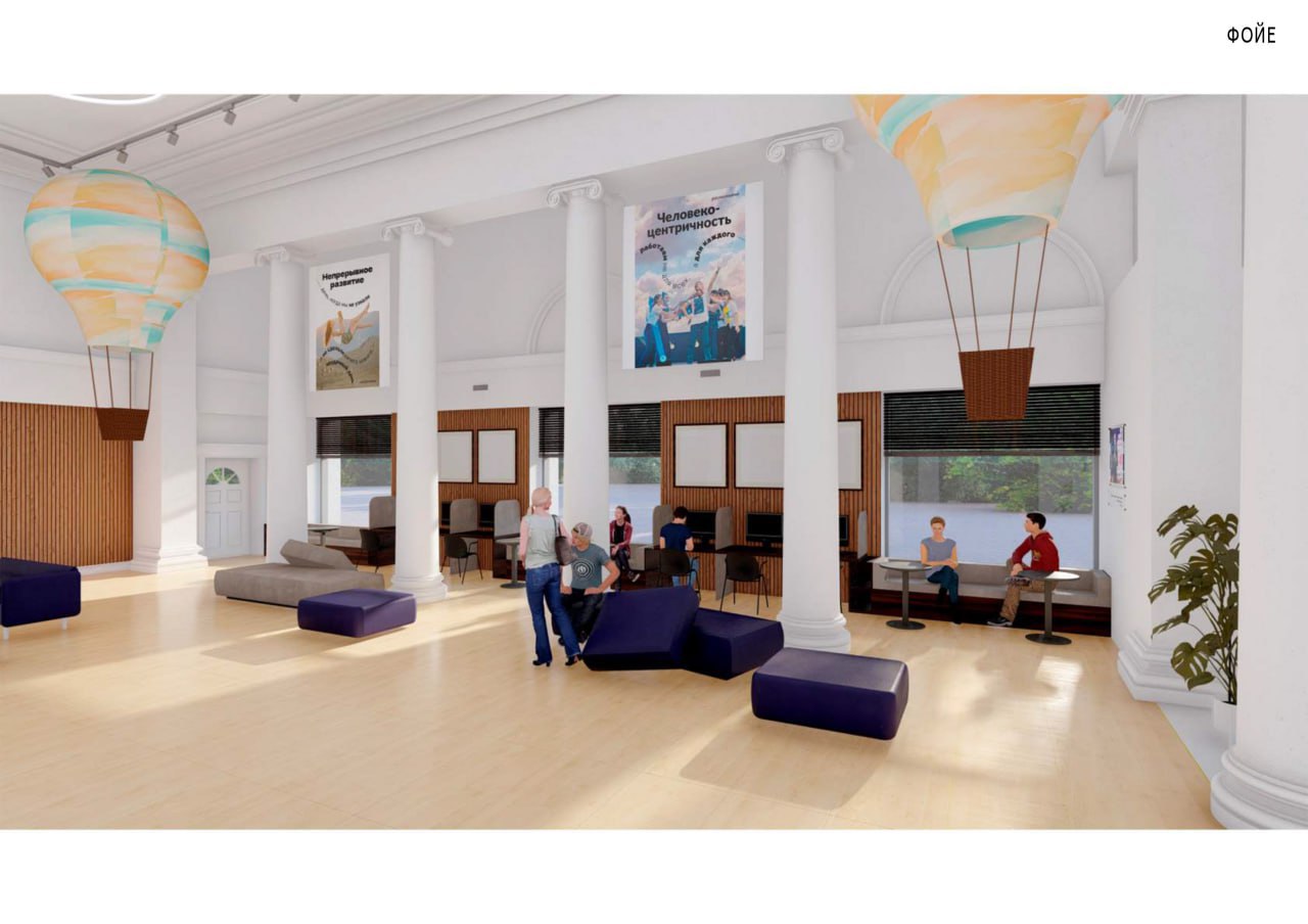 На входе в здание предполагается обустроить большое помещение-трансформер, которое будет использовано под различные мероприятия, также будет выделен целый комплекс лекционных пространств, коворкинг-зоны и большой актовый зал.