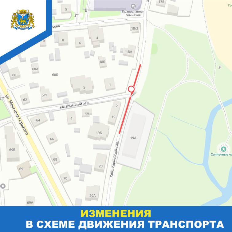 С 9 октября этого года по 8 октября 2026 года закрывается одна полоса улицы Красноармейская набережная в районе дома № 19-А при движении от улицы Максима Горького в сторону Казарменного переулка.