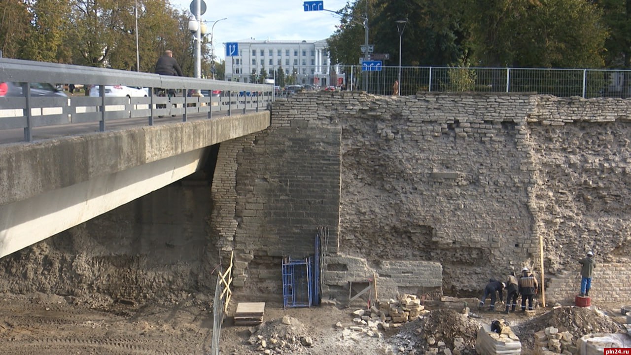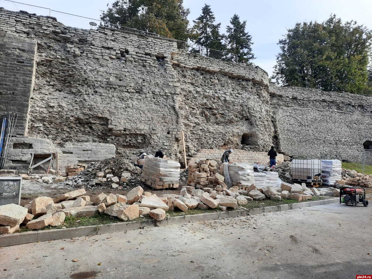 В центре Пскова началась вычинка каменной кладки стены Окольного города