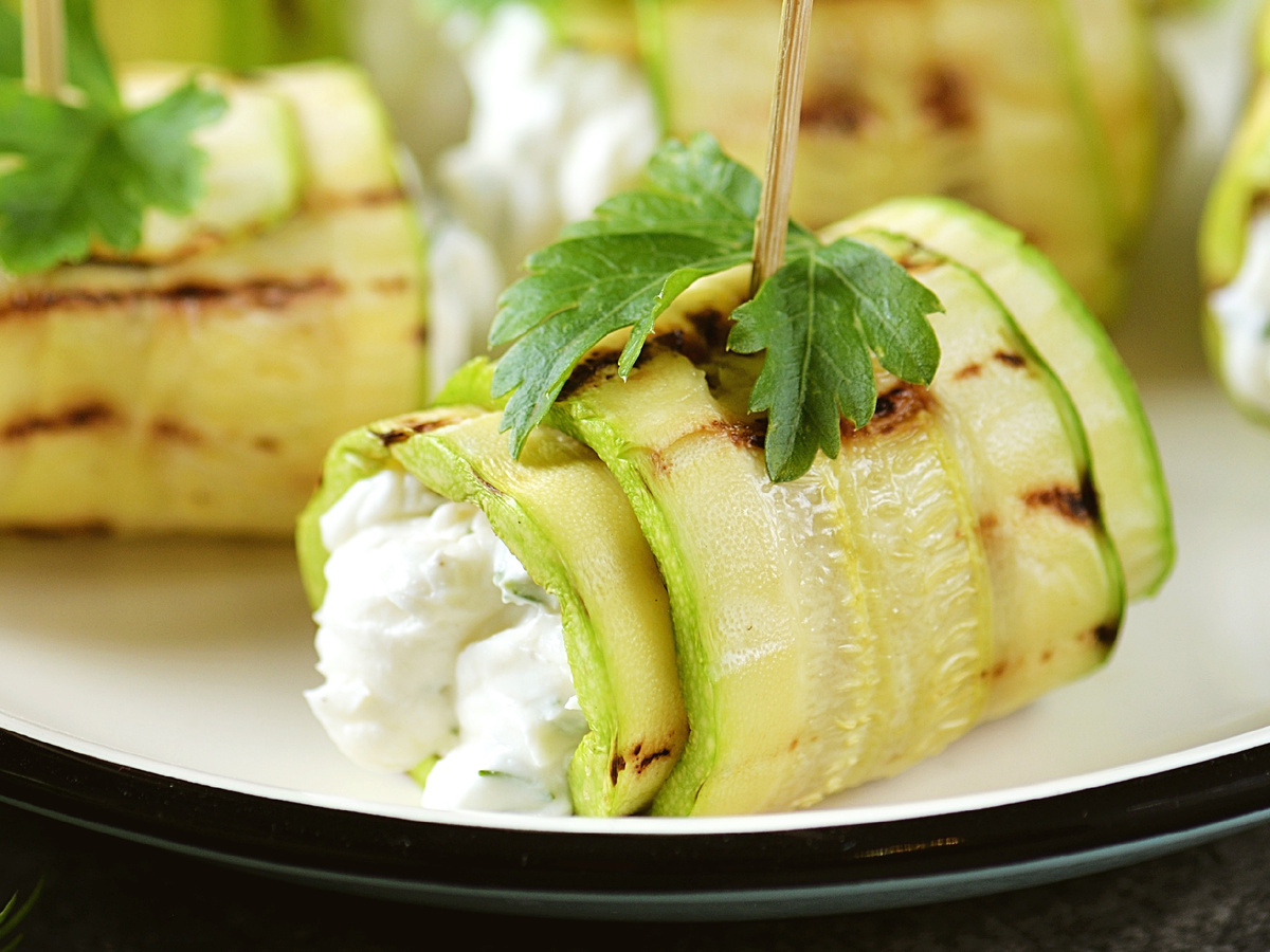 Готовую начинку нужно тщательно перемешать. Она должна быть довольно плотной, чтобы не вытекала при сворачивании. После этого, берется охлажденный ломтик кабачка, на край которого выкладывается чайная ложка начинки. Ломтик аккуратно сворачивается, и при желании фиксируется шпажкой.