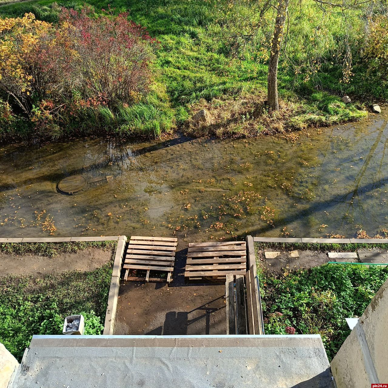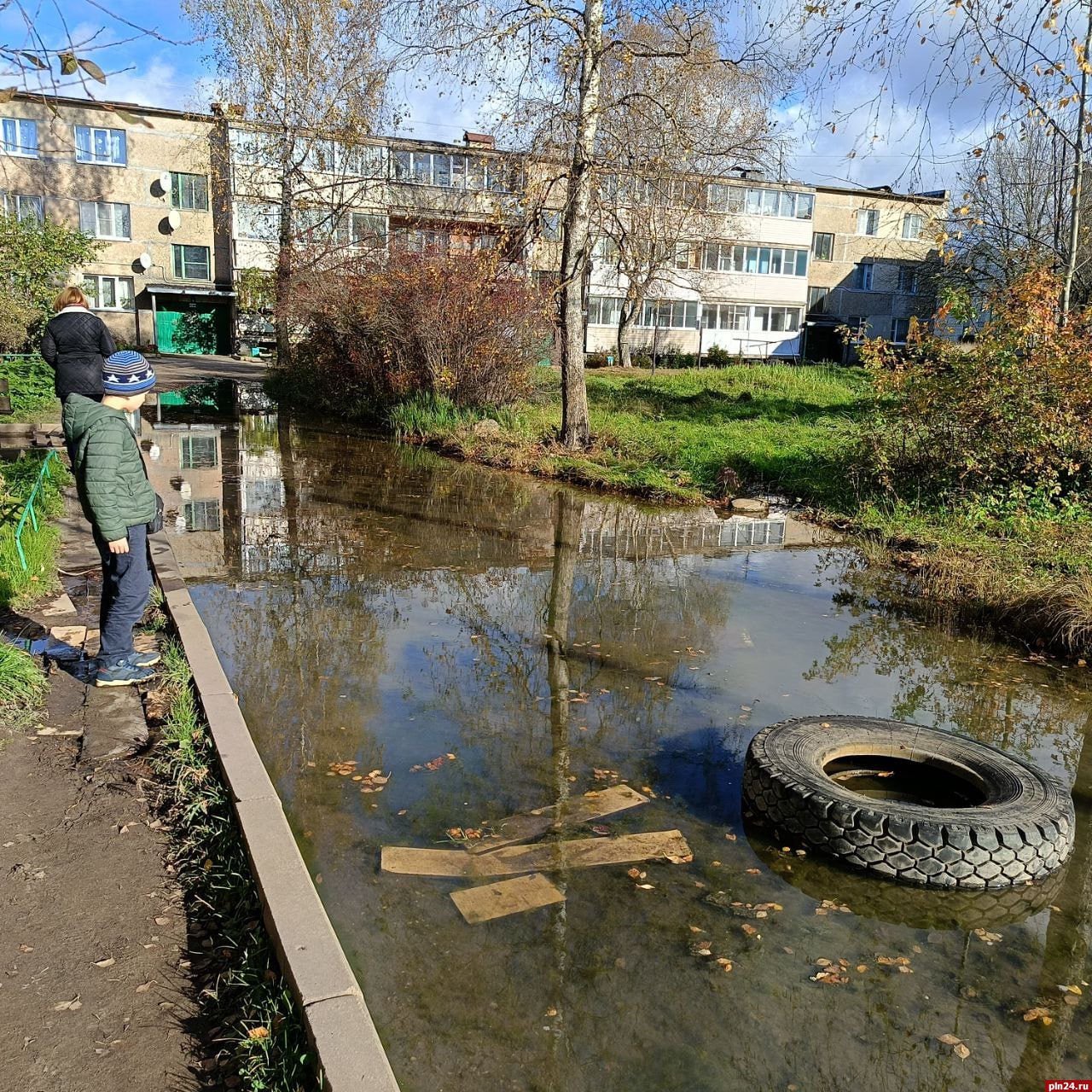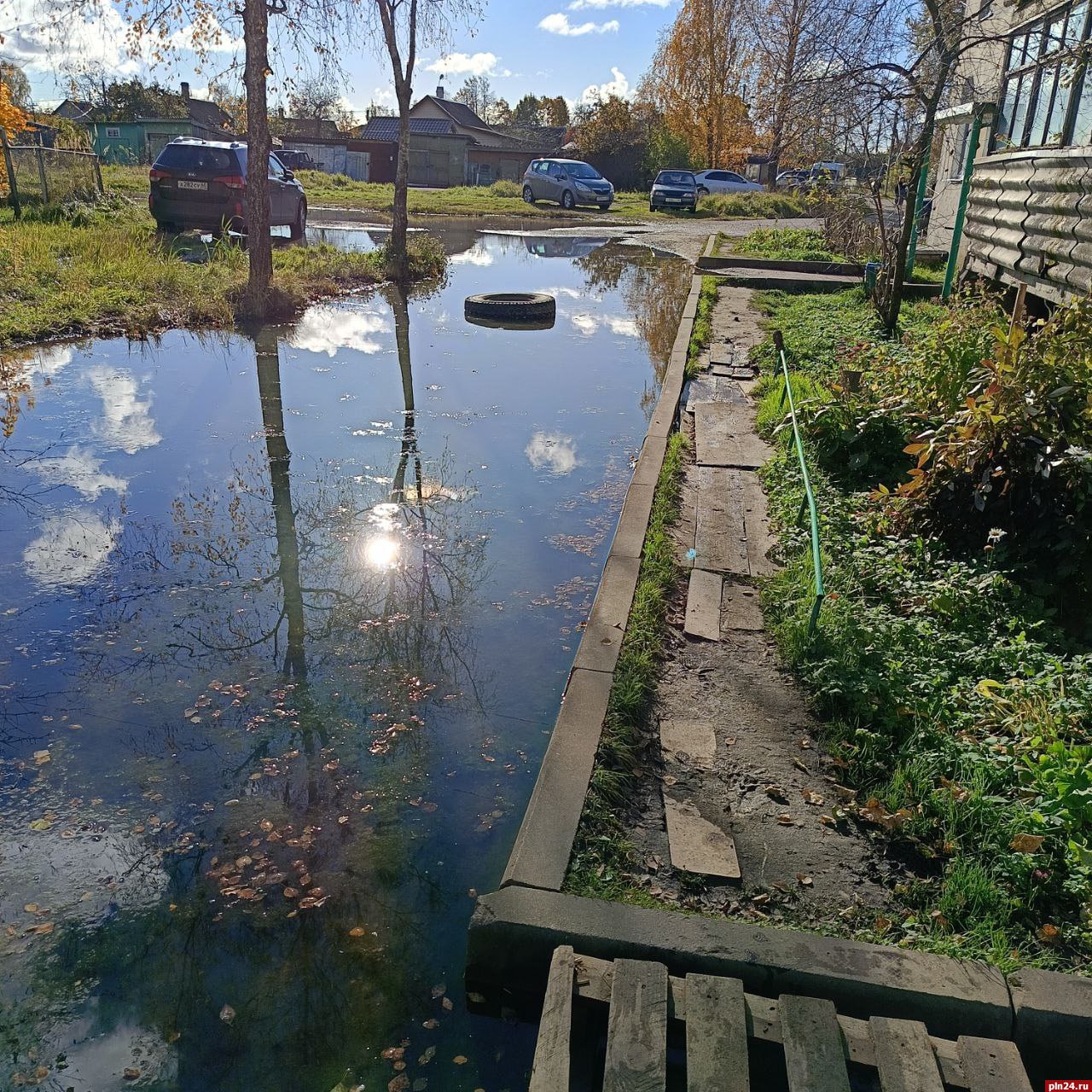 «В Гдове на улице Никитина 34-а функционирует несанкционированный водный объект. На дороге несколько лет скапливается вода, причем она не дождевая, а самотёком из какой-то трубы. Дорога стала непроезжей. Местные жители ходят рядом по досочкам. Дом 34-а теперь известен в Гдове как «дом с лужей». В воде уже поселились водоросли, формируется отдельная экосреда. Дальше должен произойти процесс зарождения разумной жизни, которая выберется на сушу и наконец сформирует ответственные органы местного самоуправления, способные решить проблему»