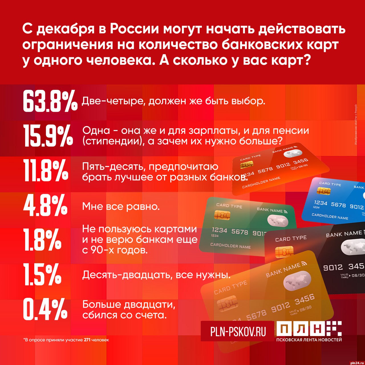 С декабря в России могут начать действовать ограничения на количество банковских карт у одного человека. Псковская Лента Новостей провела опрос, в котором выяснила, сколько банковских карт на руках у псковичей?