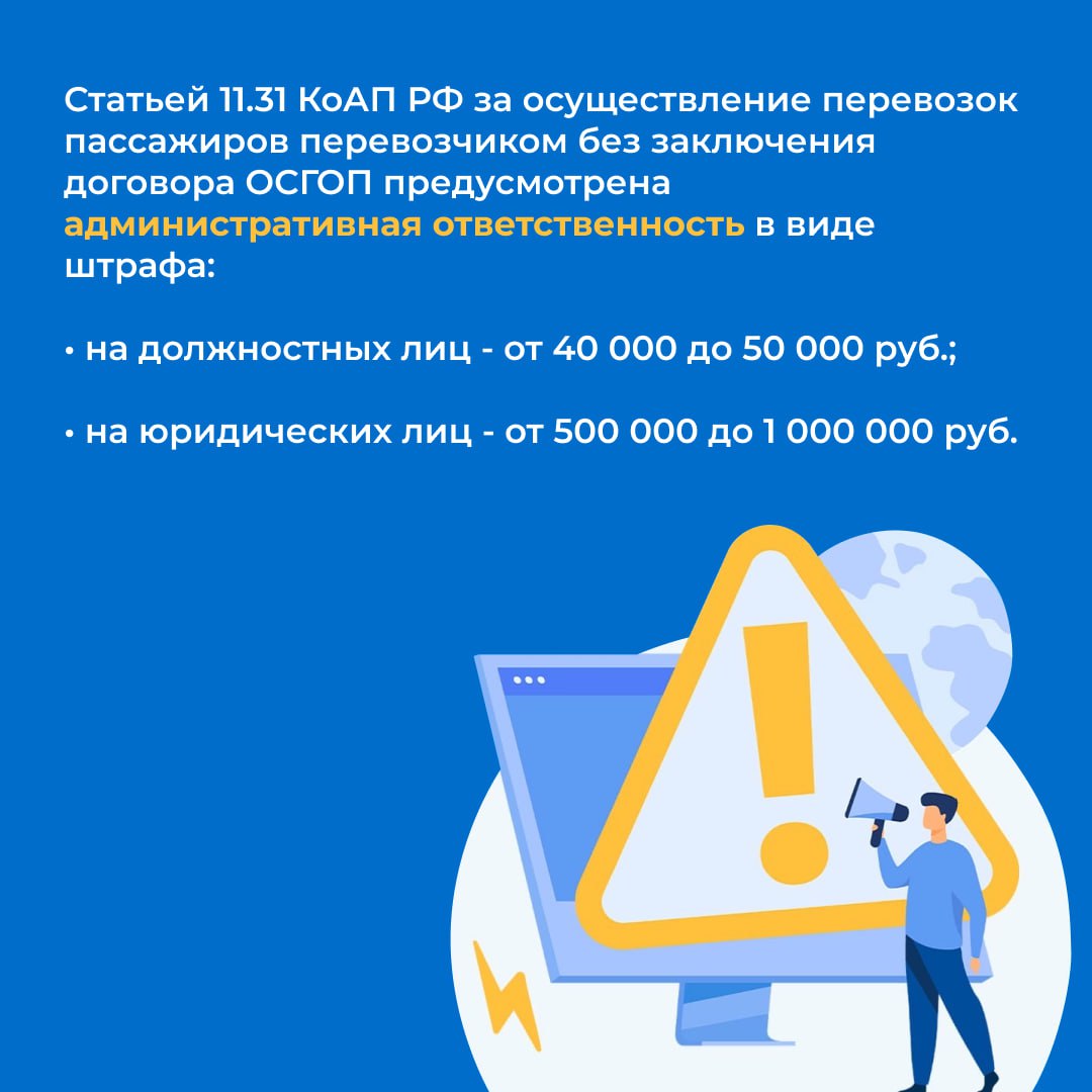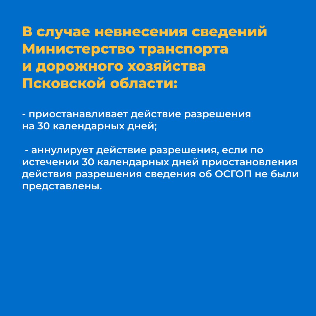 Перевозчики, получившие разрешение на работу такси, должны заключить договор обязательного страхования гражданской ответственности перевозчика за причинение при перевозках пассажиров вреда их жизни, здоровью, имуществу (ОСГОП) и уведомить об этом Министерство транспорта и дорожного хозяйства Псковской области.