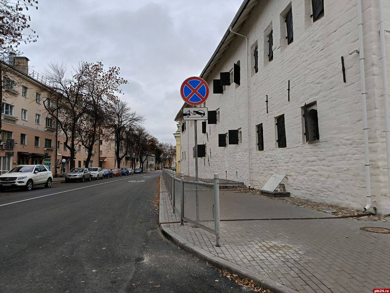 Выполнена установка дорожного знака, запрещающего остановку транспорта вдоль здания псковского музея.