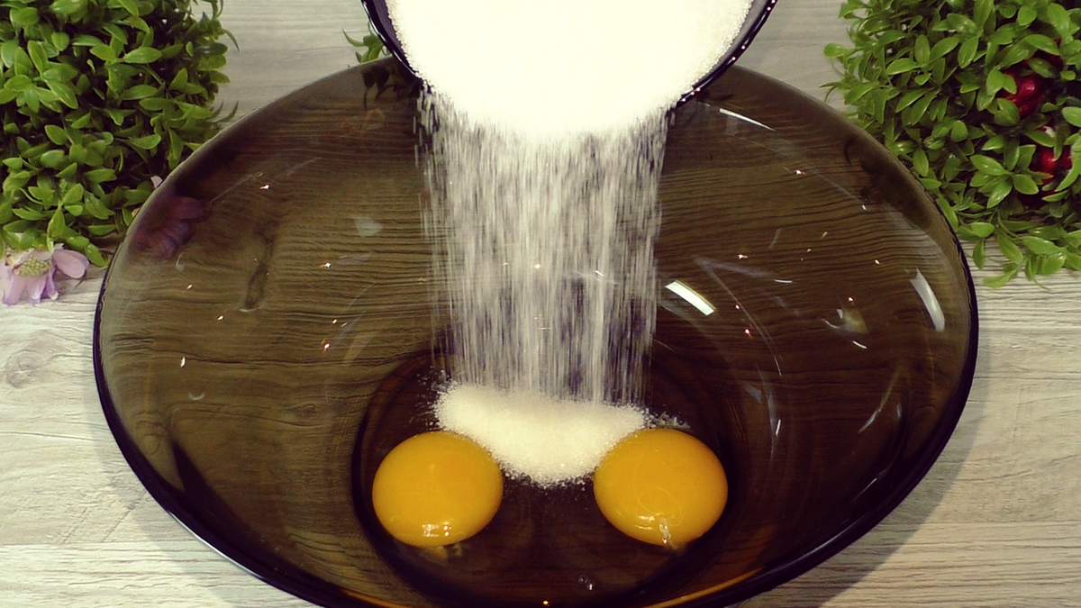 1. В глубокой миске взбить яйца с сахаром и щепоткой соли до получения однородной массы. Для этого достаточно использовать обычный венчик, никаких специальных приборов не потребуется.