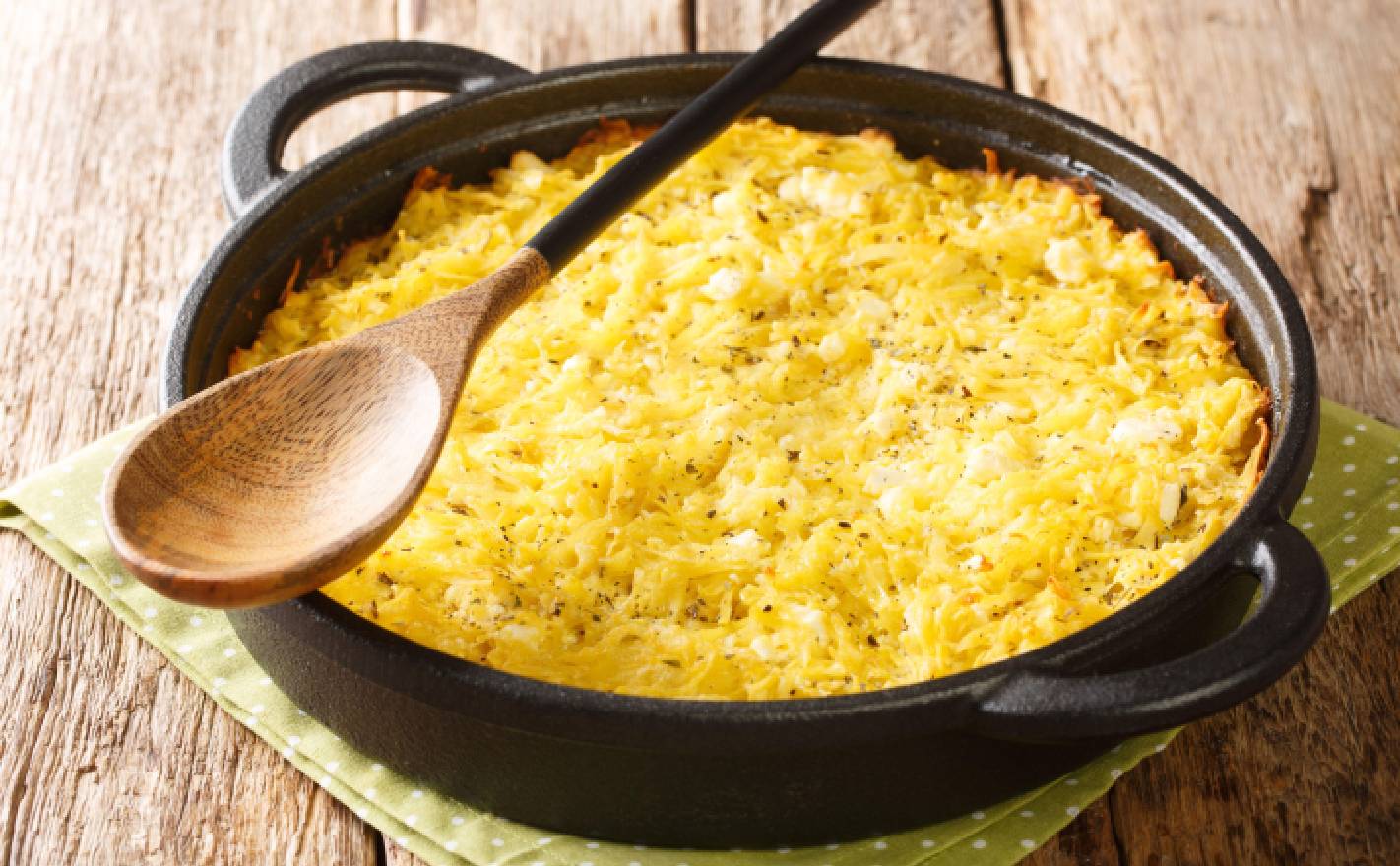 Для начала натрите сыр на крупной терке. Добавьте в ту же миску творог, яйца, мелко нарезанную зелень и муку. Тщательно перемешайте. Можно немного посолить по вкусу или добавить другие любимые специи. Сковороду смажьте небольшим количеством масла. Выложите на нее тесто и разровняйте.