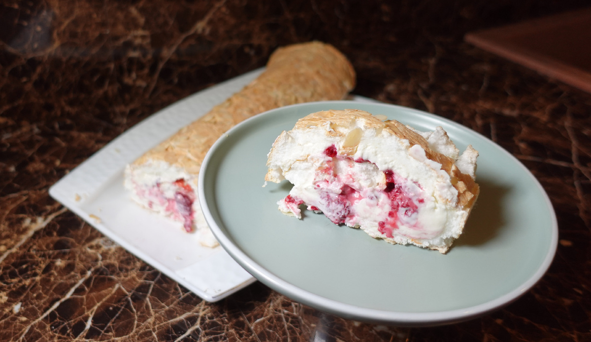 Для крема нужно взбить творожный сыр, сметану и подсластитель до однородной массы. Как только меренга остынет, намазать её кремом, добавить ягоды и аккуратно свернуть рулет, дав ему постоять 2-3 часа в холодильнике для лучшего пропитывания.
