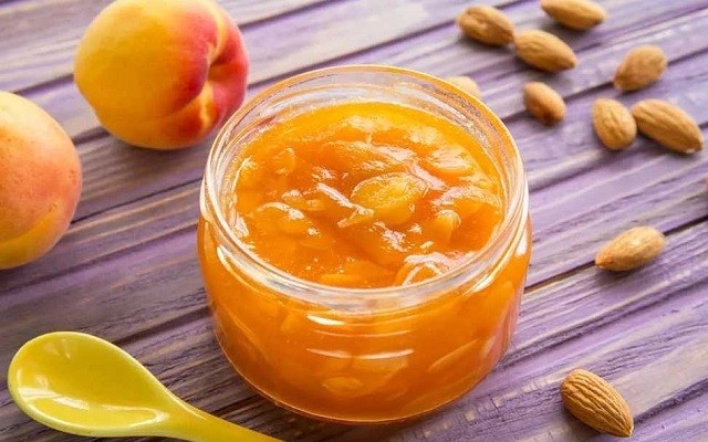 - Ингредиенты: 1 кг абрикосов, 150 г очищенного миндаля, 1 кг сахара.
