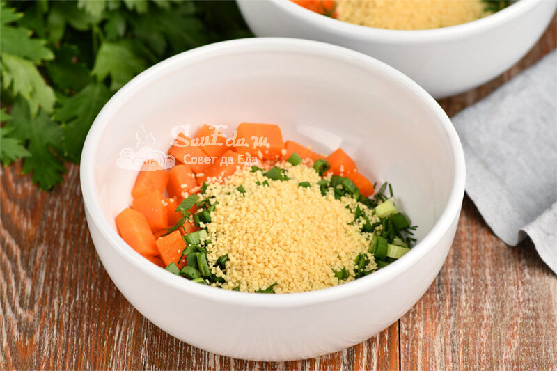 Этот салат обогатится яркими вкусами! В небольшой посуде смешайте пять столовых ложек кускуса с щепоткой соли и одной чайной ложкой растительного масла. Приготовьте на пару ложек горячей воды и дайте настояться в течение пяти минут. Затем добавьте нарезанные помидоры и сладкий перец, а также нарезанную зелень: укроп, петрушку и зеленый лук. Дополните салат соком лимона и перемешайте все ингредиенты.