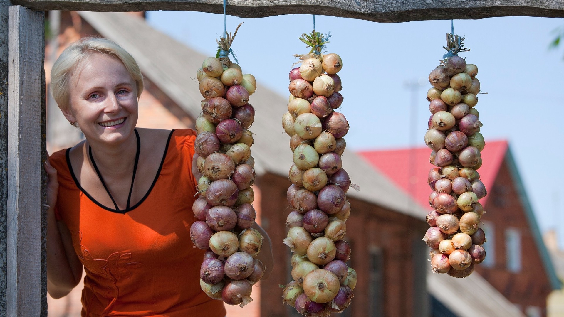 Аккуратно выдергивайте лук из грядки и обрезайте корни, оставляя небольшие «пеньки». Зеленую часть тоже удалите, но не полностью — оставьте длинную «ножку». Отправьте собранные луковицы сушиться в темное, прохладное и проветриваемое помещение, например, на веранду или предбанник.