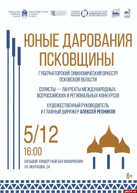 Концерт «Юные дарования Псковщины» пройдет в большом концертном зале Псковской областной филармонии 5 декабря. Молодые талантливые музыканты выступят с Губернаторским симфоническим оркестром Псковской области под художественным руководством Алексея Репникова.