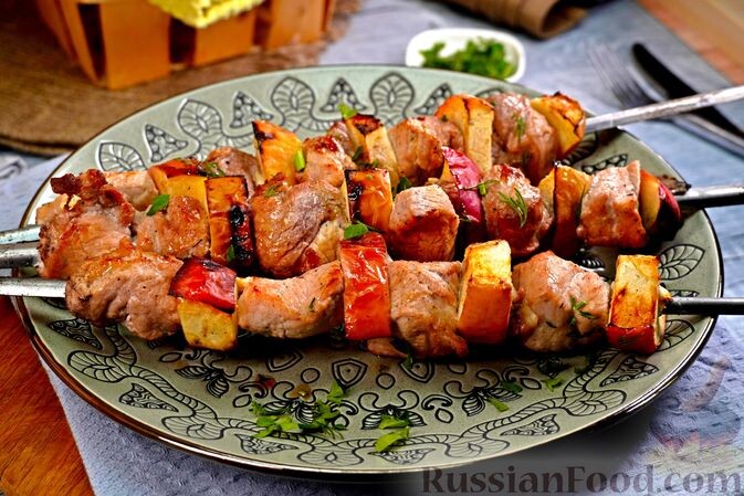 - Свиной шашлык с яблоками — это уникальное сочетание, благодаря которому мясо становится особенно мягким и ароматным. Используйте свежие яблоки и лимонный сок в качестве маринада, добавляя немного горчицы и перца для пикантности.