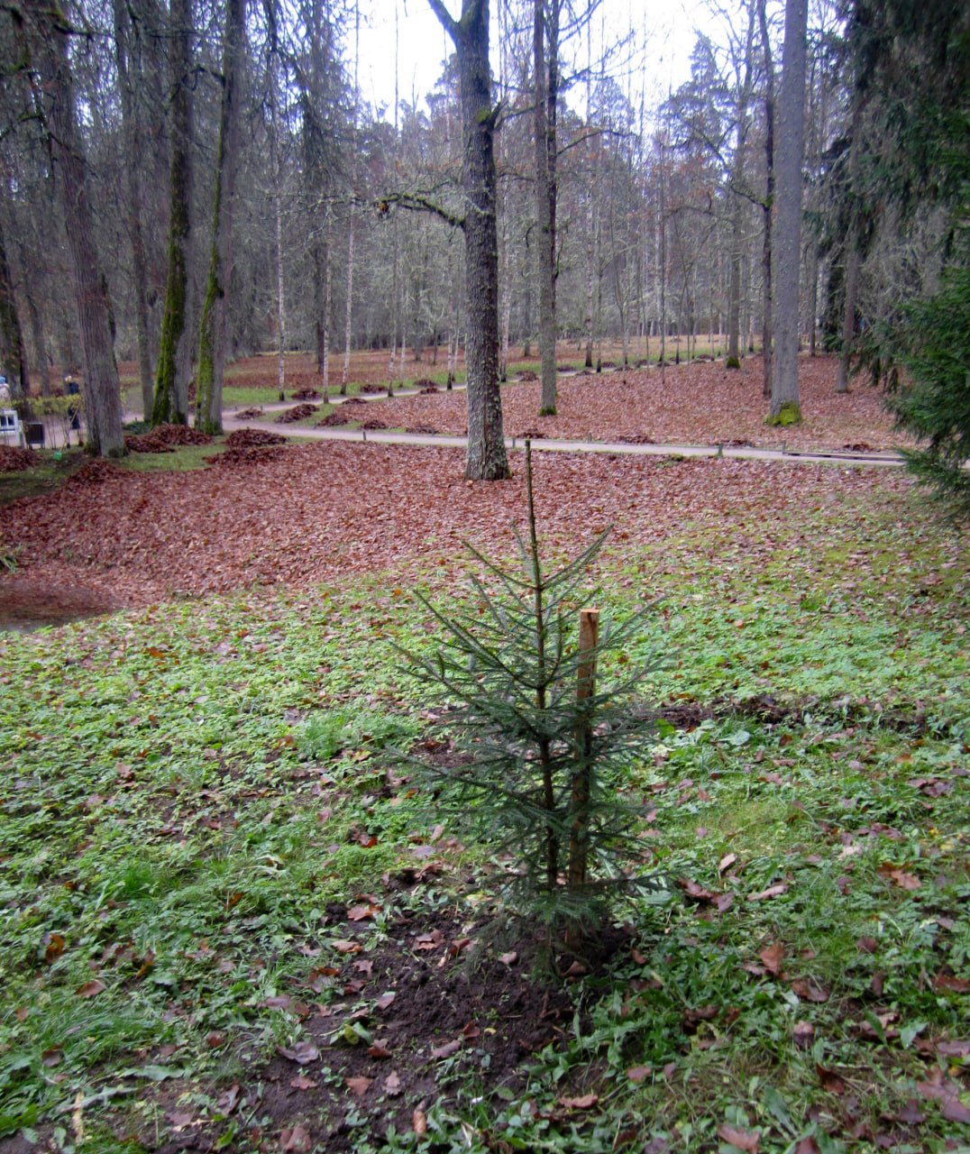 Осенью этого года на аллее, протяженность которой составляет 405 метров, было высажено семь молодых елей. Это часть масштабных мер по замещению старовозрастных деревьев, погибших из-за короедов. Ранее, в сентябре, были выкорчеваны пни, а образовавшиеся котлованы заполнены свежим грунтом.