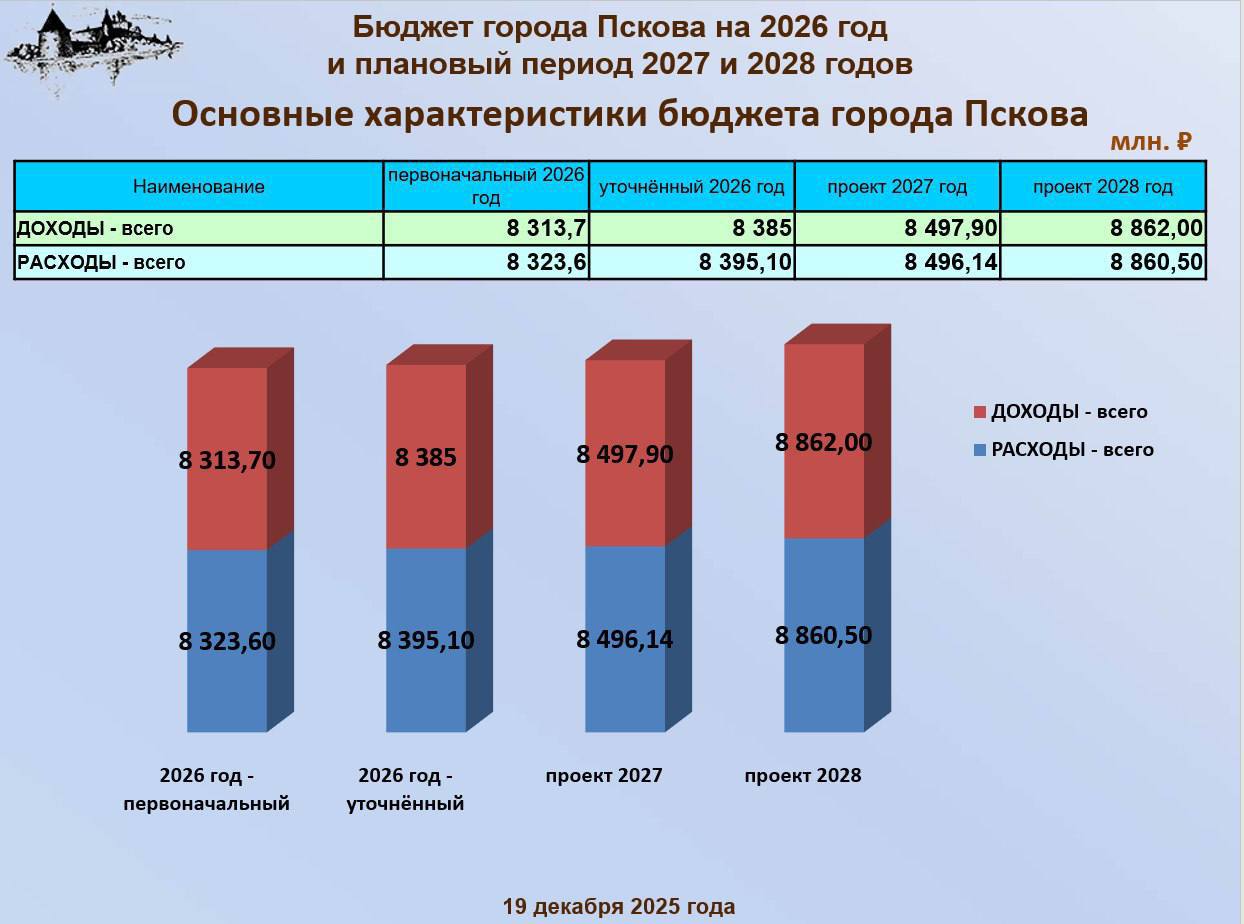 Утверждён бюджет Пскова на 2026 год и плановый период 2027-2028 годов. Ко второму чтению городу выделено дополнительное финансирование по всем трём годам: 71 млн. рублей на 2026 год, 52 млн. на 2027 год и 49 млн. на 2028 год. Доходная часть на предстоящий год составляет 8,3 млрд.рублей.