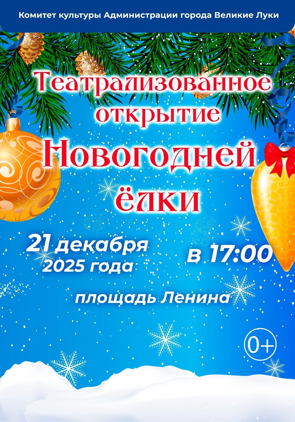 В это воскресенье, 21 декабря 2025 года, в 17:00 на площади Ленина в Великих Луках состоится долгожданное театрализованное открытие главной новогодней ёлки под названием «Навстречу чудесам».