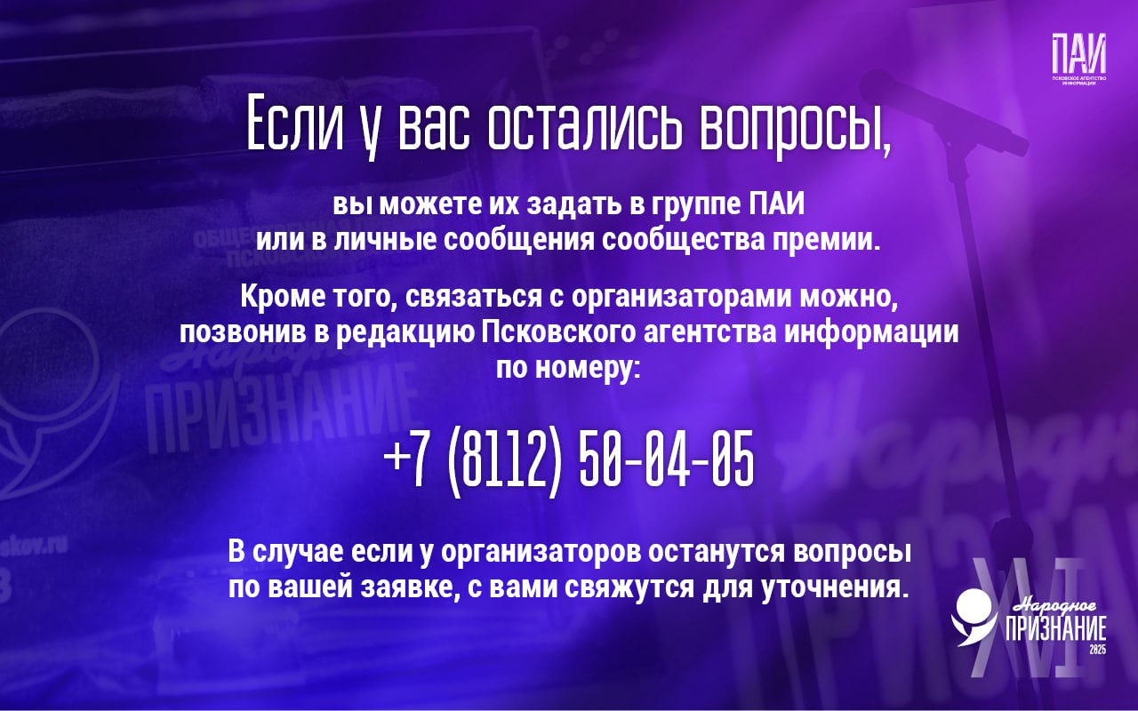 Если у вас остались вопросы, их можно задать в группу ПАИ в соцсети «ВКонтакте» или в личные сообщения сообщества премии. Также связаться с организаторами можно, позвонив в редакцию Псковского агентства информации по номеру: +7 (8112) 50-04-05.