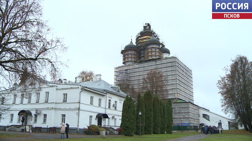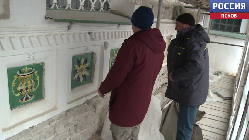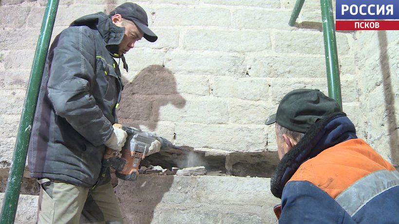 В Псковском Кремле продолжается реставрация кафедрального Троицкого собора. На месте реставраторы воссоздают утраченные валики и карнизы. А разрушившиеся изразцы из поливной керамики восстановили в московских мастерских. Сейчас специалисты отбивают штукатурку со стен собора, идет реставрация и контрфорсов собора.