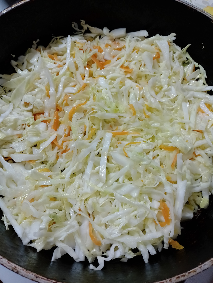 После того как овощи обжарены, следует добавить к ним капусту, приправить солью и накрыть крышкой, давая тушиться до готовности. Чтобы улучшить вкус, добавьте немного сливочного масла, когда начинка прогреется.