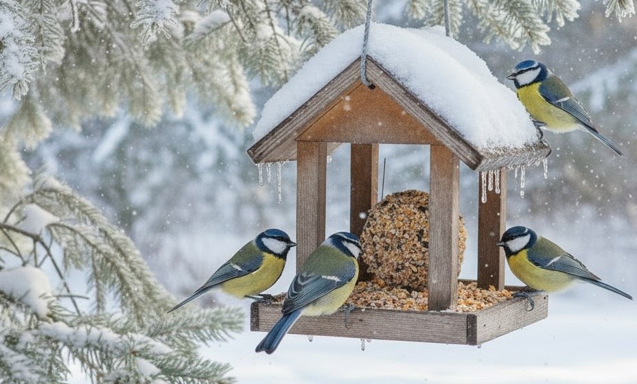 Зимой птицам нужен калорийный и безопасный корм — не хлеб. Подходят готовые зерносмеси, несоленые и нежареные семечки, свежие или сушеные ягоды, замороженные яблоки и несоленое сало.