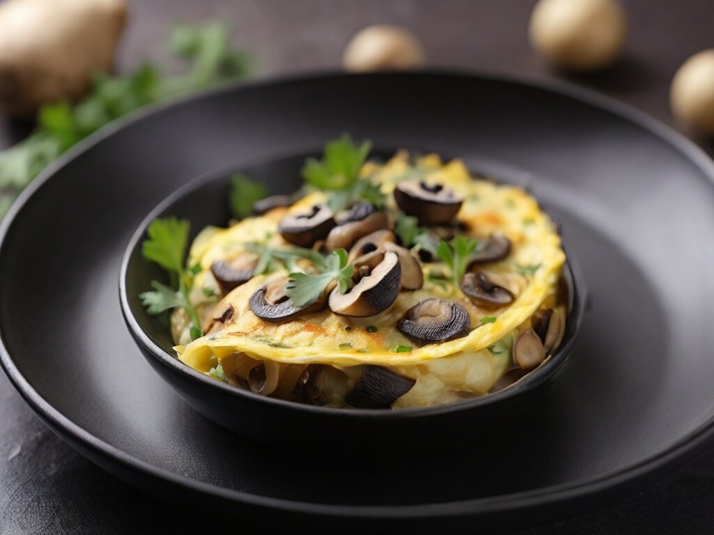 - Приготовление: Обжарьте картофель и грибы на среднем огне, вбейте яйца, вылейте молоко и готовьте до золотистой корочки.