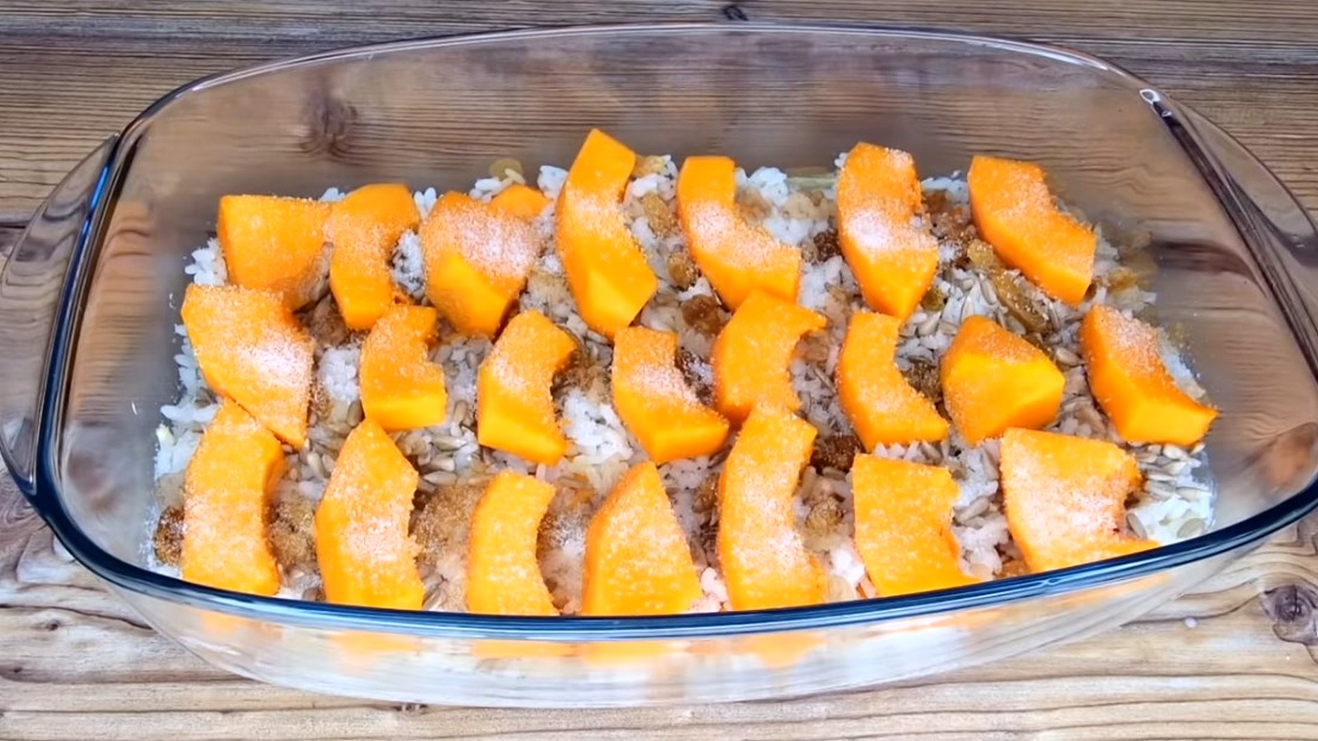 Форму для приготовления смазываем маслом, выкладываем половину кусочков тыквы, посыпаем сахаром, очищенными семечками и изюмом, сверху кладем рис, снова добавляем тыкву, изюм и семечки.