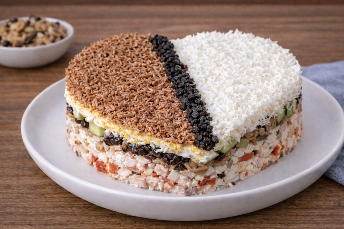 Структура салата довольно интересна: каждый ингредиент вносит свою ноту в общий ансамбль, создавая слои, которые не только красиво выглядят, но и отлично держат форму.