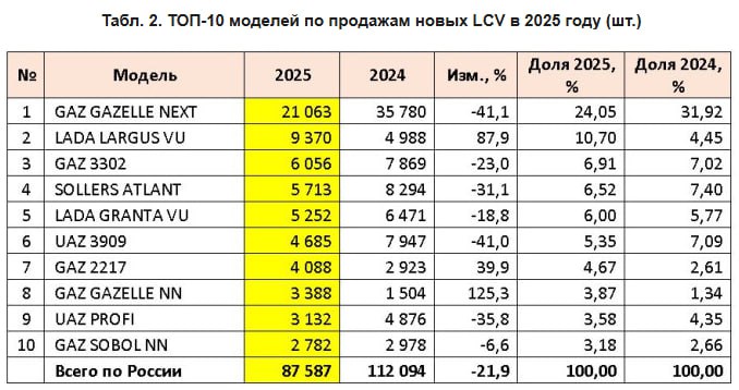 В топ-5 модельного рейтинга по итогам 2025 года вошли GAZ Gazelle Next (21 тыс. единиц), Lada Largus VU (9,4 тыс. единиц), GAZ 3302 (6,1 тыс. единиц), Sollers Atlant (5,7 тыс. единиц) и Lada Granta VU (5,3 тыс. единиц).