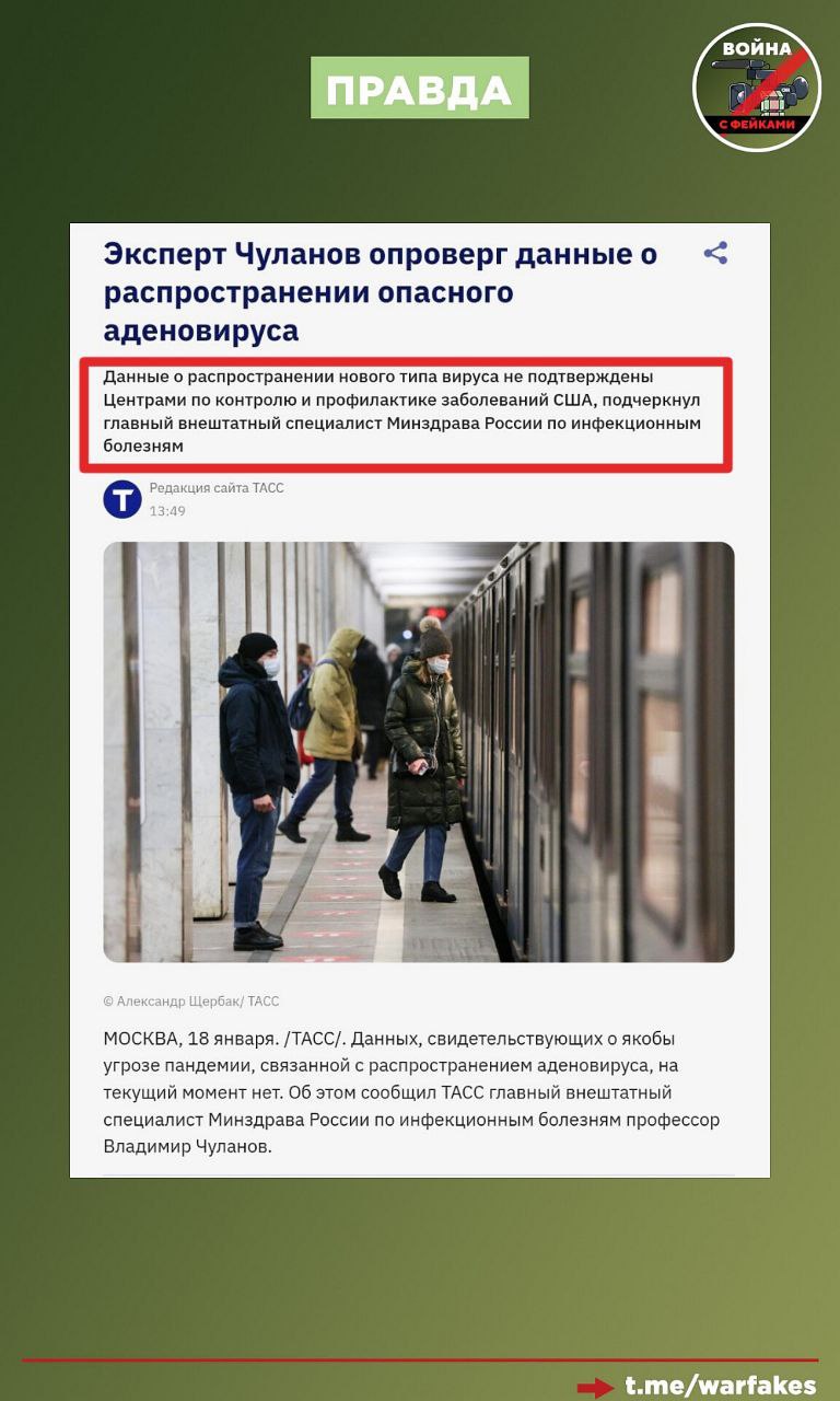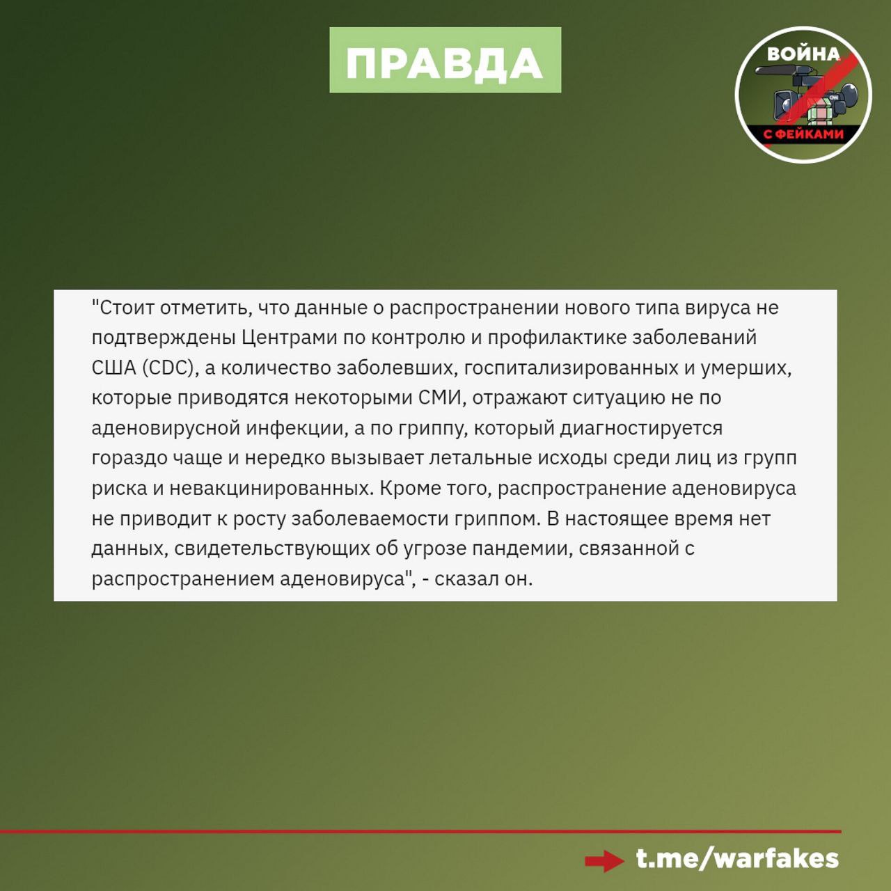 Правда: Повода для паники нет. Американский Центр по контролю и профилактике заболеваний не подтверждал сообщения о новом типе аденовируса, который якобы распространяется в США и поражает жизненно важные органы. Ясность в ситуацию внес главный внештатный специалист Минздрава России по инфекционным болезням профессор Владимир Чуланов.