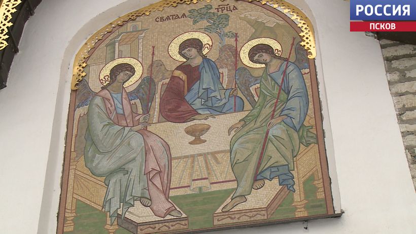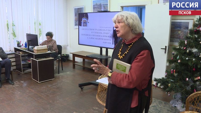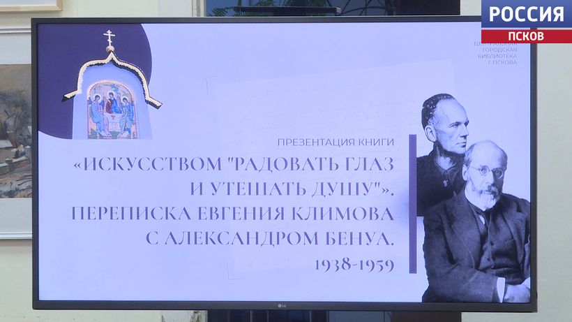 О художнике, который навсегда связан с Псковом напомнили в Центральной городской библиотеке областного центра. Краевед Тамара Вересова презентовала книгу "Искусством" радовать глаз и утешать душу". Это публикация 20-летней переписки Александра Бенуа и Евгения Климова - до, во время и после второй мировой. И если Бенуа - одна из главных фигур серебряного века, то Климов - лишь один из художников-пейзажистов. Однако именно мозаика Евгения Климова украшает подход к Троицкому собору в Пскове. Работу над иконой творец начал в 1942 году, готова Троица была как раз к освобождению города, но свое нынешнее место заняла только в 2003 году.