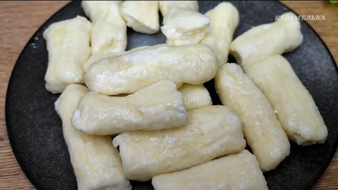 - Из теста формируется колбаска, которая нарезается на небольшие кусочки, а затем вареники опускаются в кипящую подсоленную воду. После того как они всплывут, варить их еще 1-2 минуты.