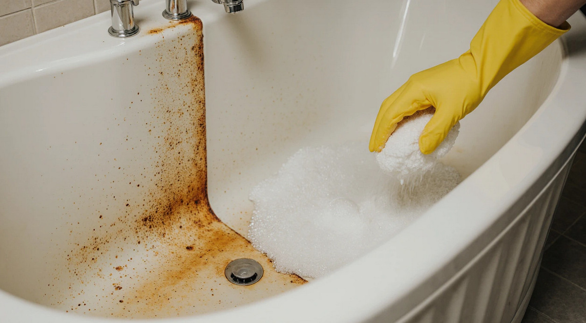 Итак, на помощь приходят дорогостоящие химические составы, обещающие освободить от ржавчины и пятен. Многие из них, к сожалению, делают больше вреда, чем пользы. Использование абразивных порошков вроде Comet может привести к повреждению эмали, а кислотные гели, такие как Cillit Bang, разъедают не только ржавчину, но и металл слива. Итог: ванна может стать настоящей «жертвой» химикатов.