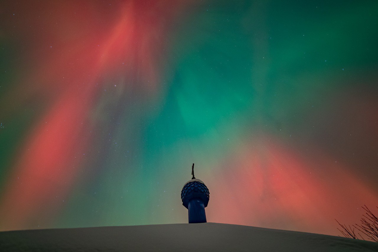 Минувшей ночью жители Псковской области стали свидетелями редкого и завораживающего зрелища – в небе над регионом полыхало яркое красно-зелёное северное сияние.