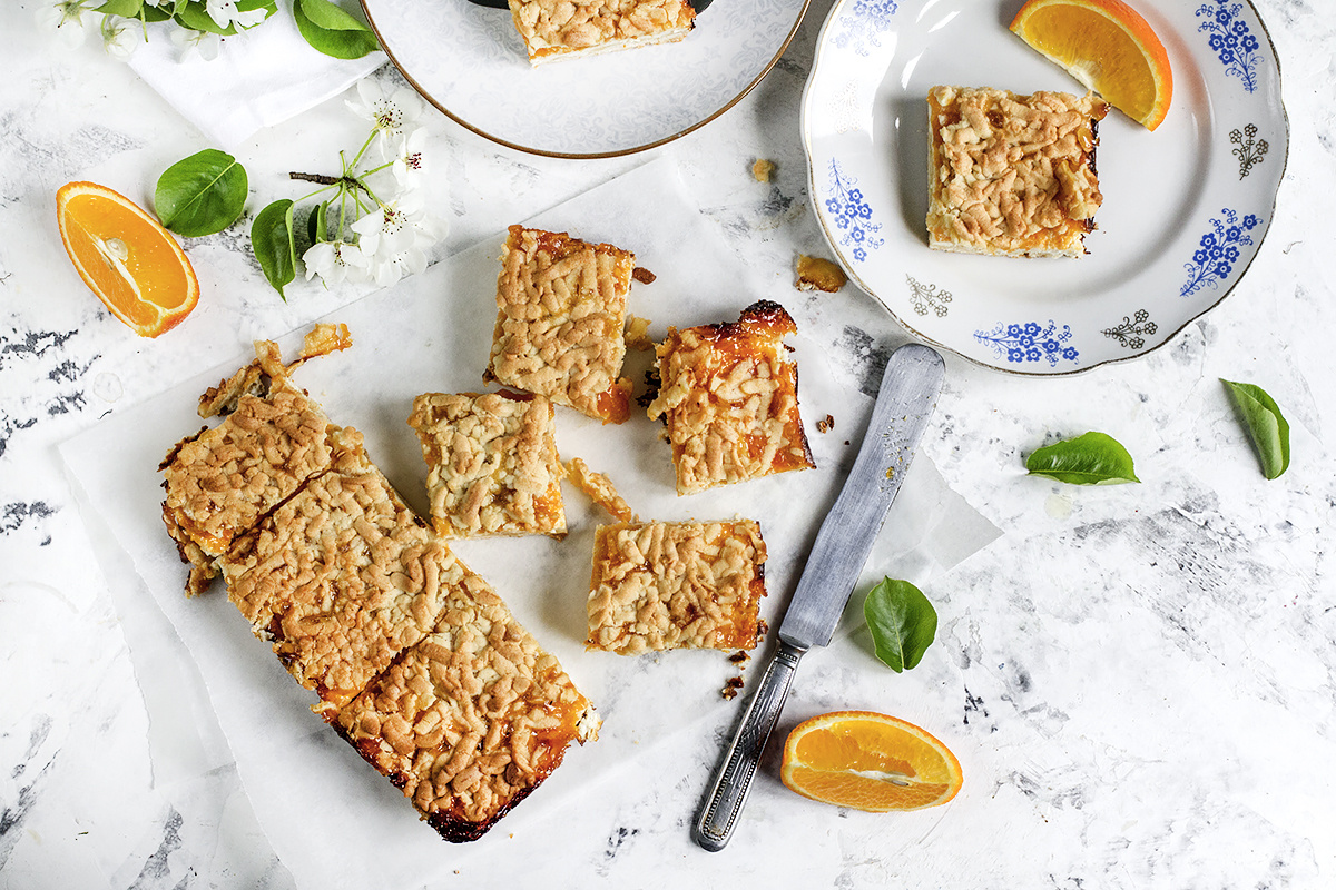 Шаг 3: На крупной терке натереть половину теста и положить его на дно формы для запекания. Выложить творожную массу, затем равномерно распределить абрикосовое варенье и сверху посыпать цедрой и кусочками апельсина. Оставшуюся часть теста натереть поверх начинки.