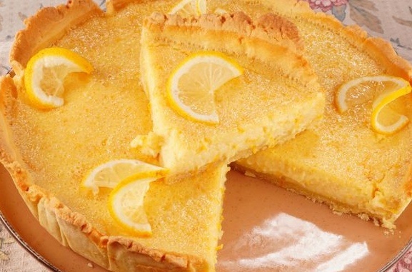 Тесто выпекается 15 минут. В это время подготавливаются цитрусы: с них срезается цедра, из фруктов выжимается сок. Яйца взбиваются с сахаром до пышной массы, после чего вводятся сливки, сок и цедра. Эту смесь затем надо аккуратно вылить в уже испечённое тесто.