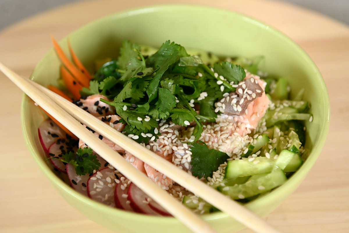 2. Традиционно поке готовится с сырой рыбой, однако для безопасности детей филе лосося можно запечь.