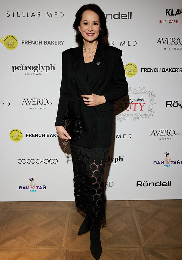 Ольга Кабо, как всегда, привлекла внимание своим элегантным образом. В черном наряде она сочетала классический пиджак и оригинальную юбку-сетку, выбрав неброские золотые украшения, что добавило изысканности в её вечерний look.